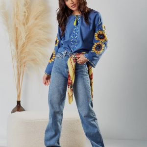 Жіноча вишиванка Соняхи (блакитна)