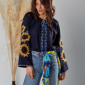 Жіноча вишиванка Соняхи (темно-синя)