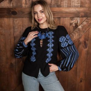 Жіноча вишиванка Залісся (чорна з голубим)