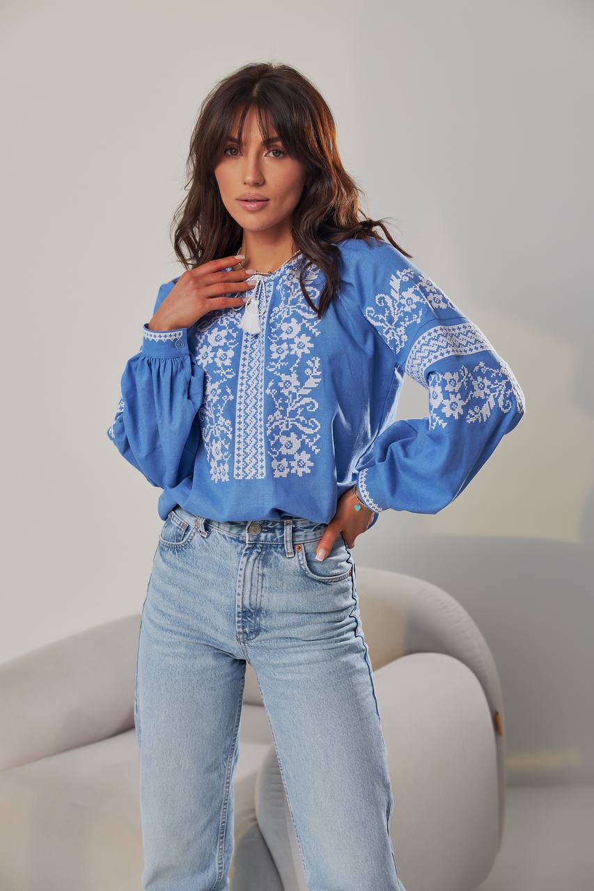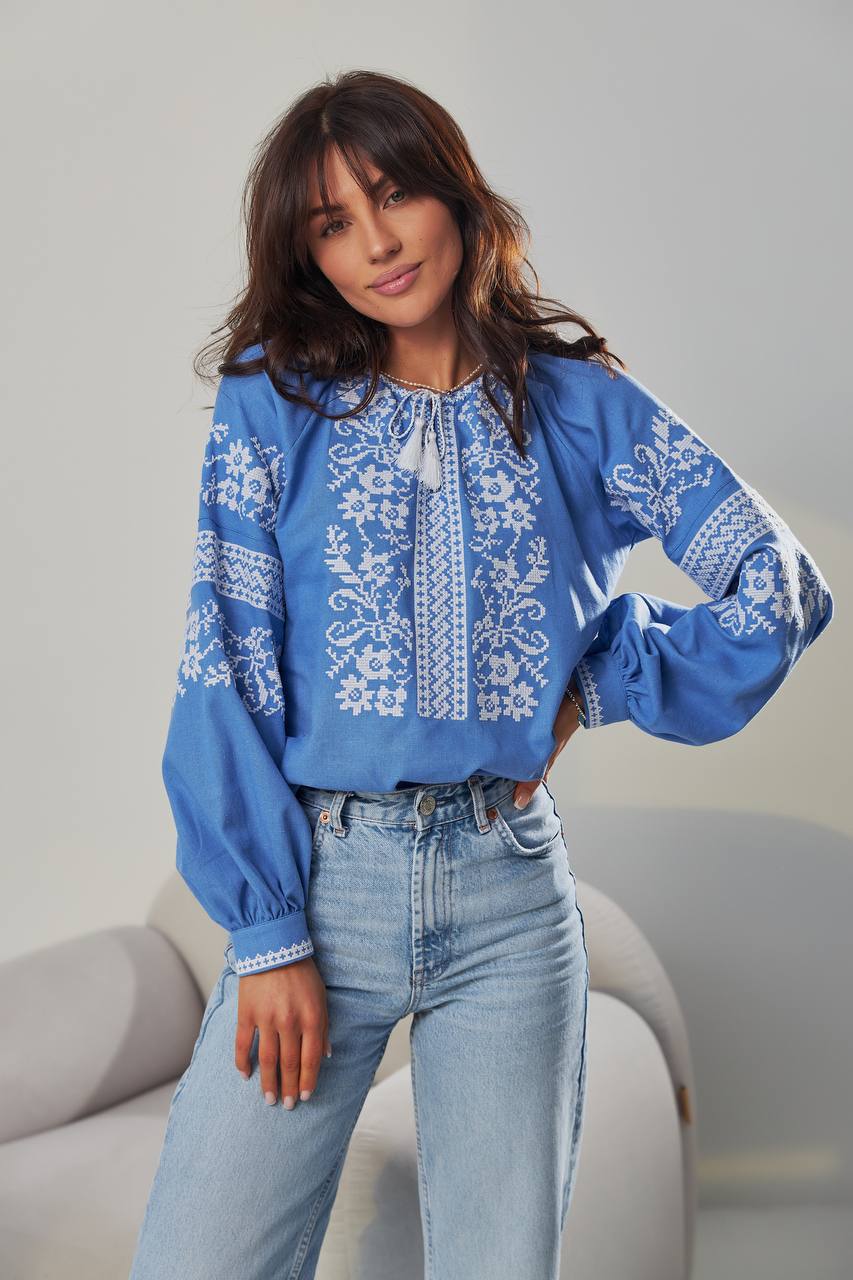Жіноча вишиванка Бандерівка (блакитна) виконана на льоні, тип вишивки хрестиком.