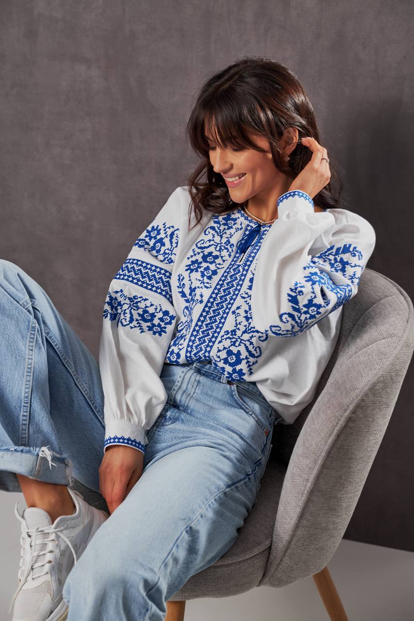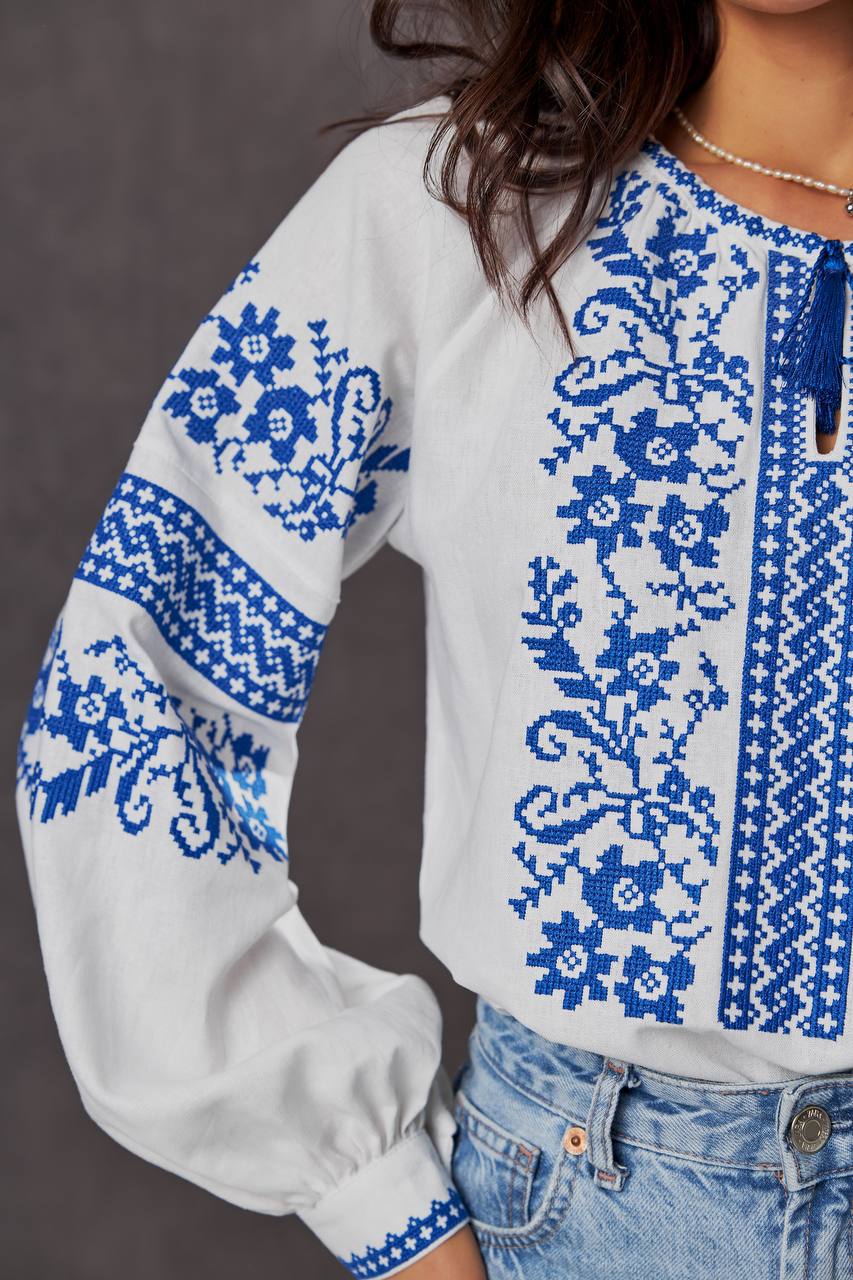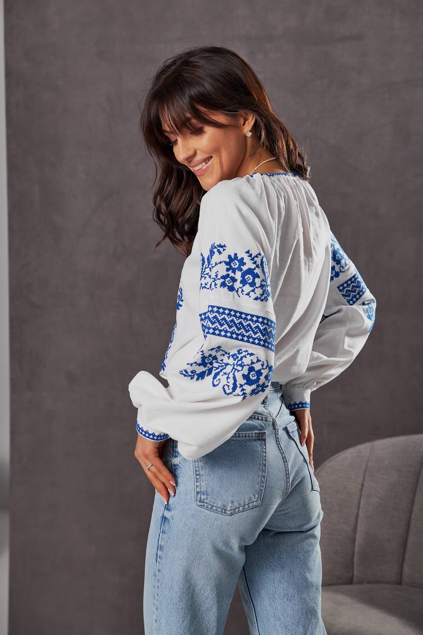 Жіноча вишиванка Бандерівка (біло-блакитна) виконана на льоні, тип вишивки хрестиком