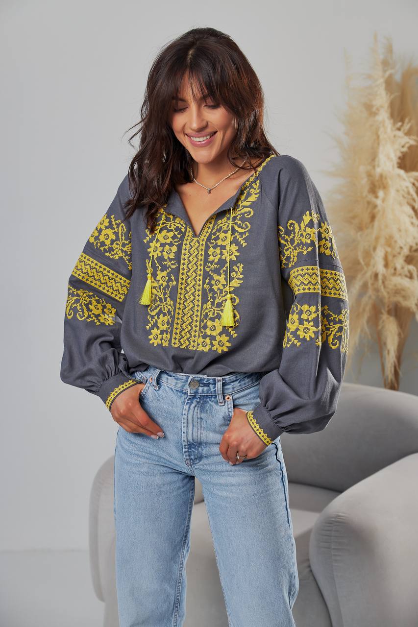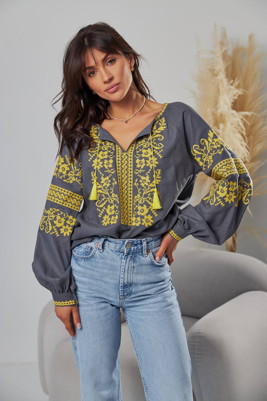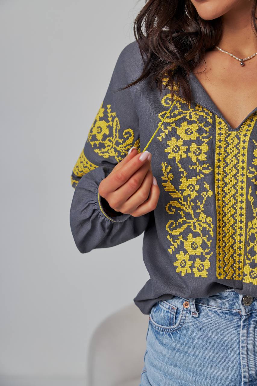 Жіноча вишиванка Бандерівка (сіро-жовта) виконана на льоні, тип вишивки хрестиком
