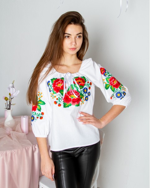 Жіноча вишиванка Галіція (біла) виконана на бавовняній тканині, тип вишивки гладдю