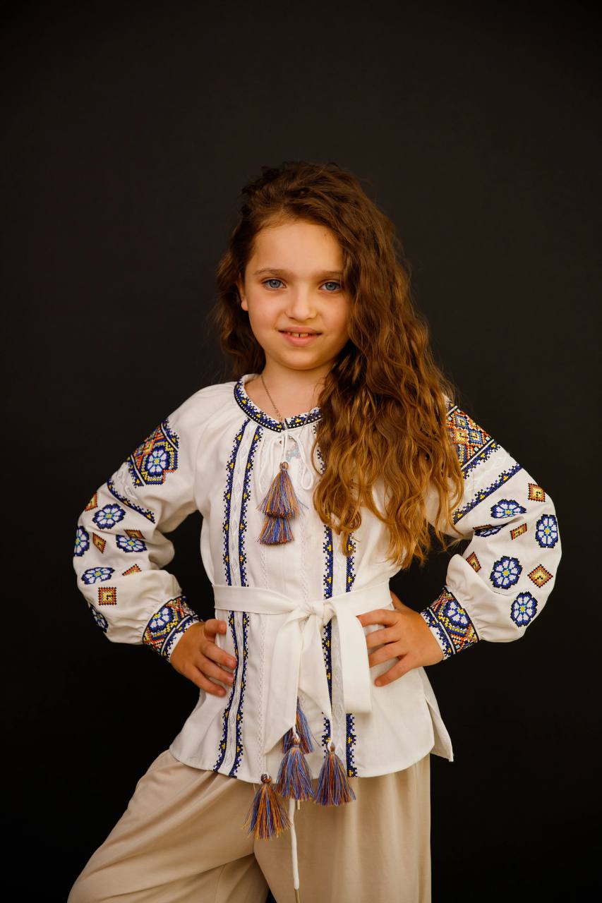 Вишиванка для дівчинки Олеся (біла з синім) виконана на натуральній тканині.
