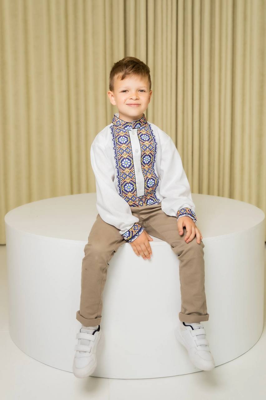 Вишиванка для хлопчика Олекса (біла з синім) виконана на натуральній тканині.