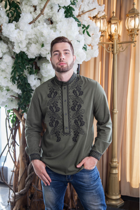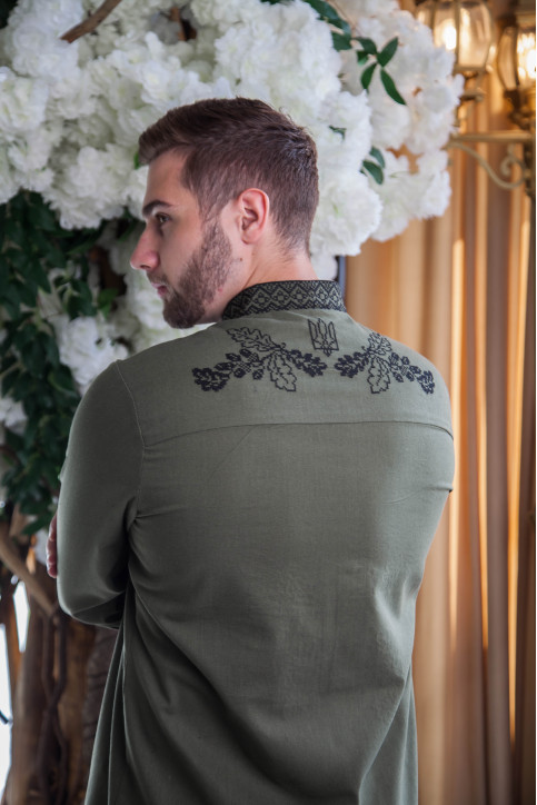 Вишиванка Міць (хакі) виконана на натуральній тканині.