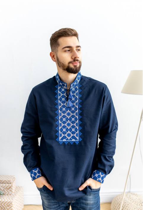 Чоловіча вишиванка Святослав ( темно-синя) виконана на льоні, тип вишивки хрестиком. Легка в догляді, приємна до тіла