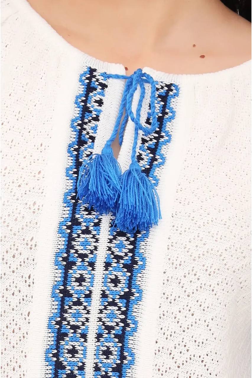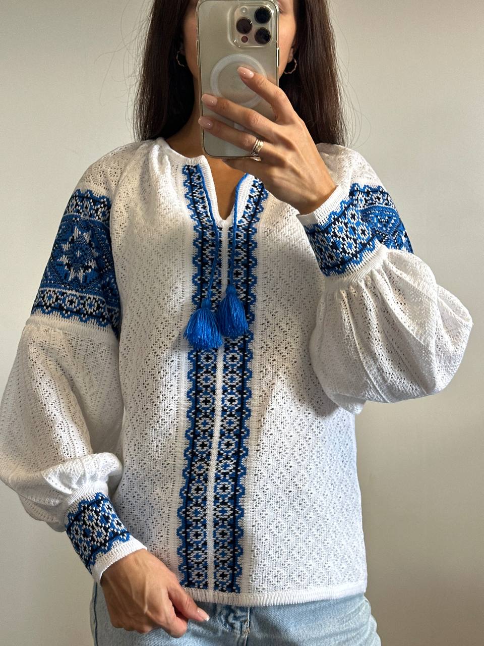 В’язана жіноча вишиванка Газдиня (біло-синя) виконана з натуральної тканини (70% бавовна, 30% льон).