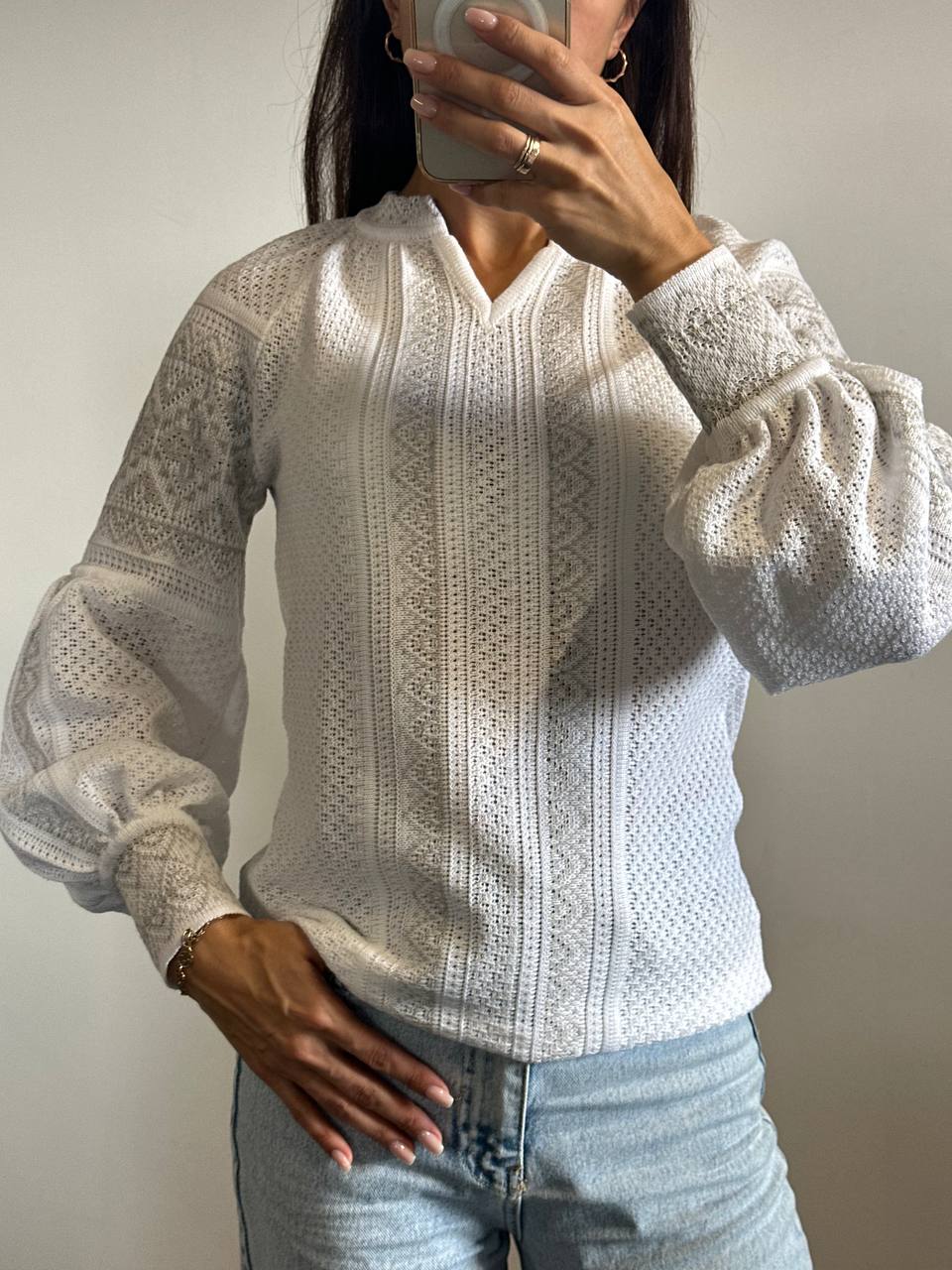 В’язана жіноча вишиванка Газдиня (біла) виконана з натуральної тканини (70% бавовна, 30% льон).