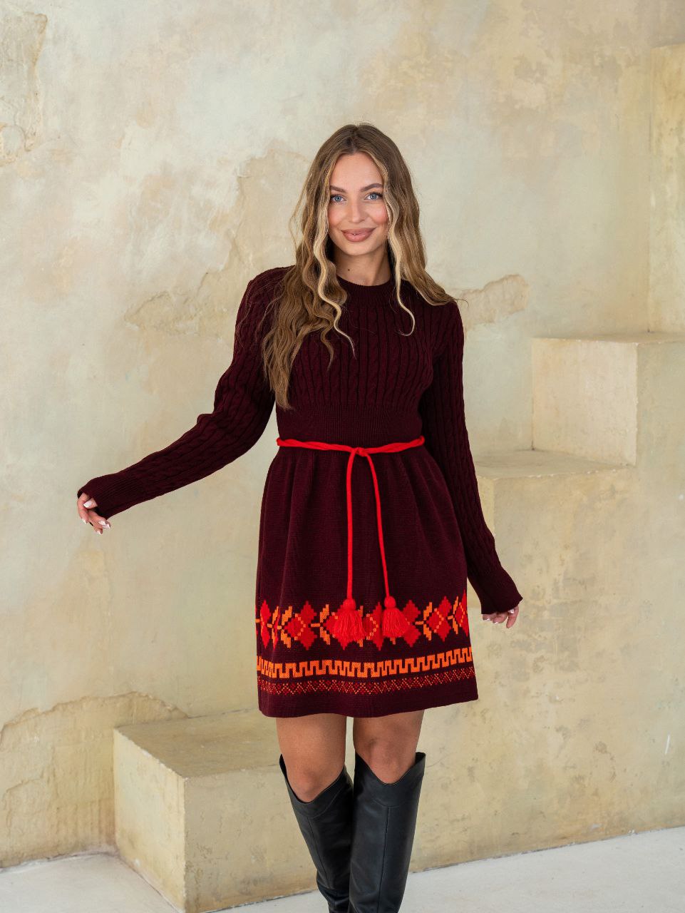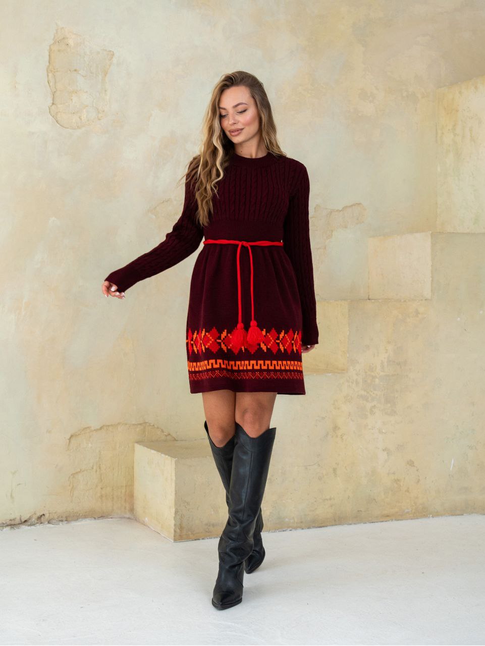 В’язана сукня Етно (бордо) є універсального розміру 44/50.