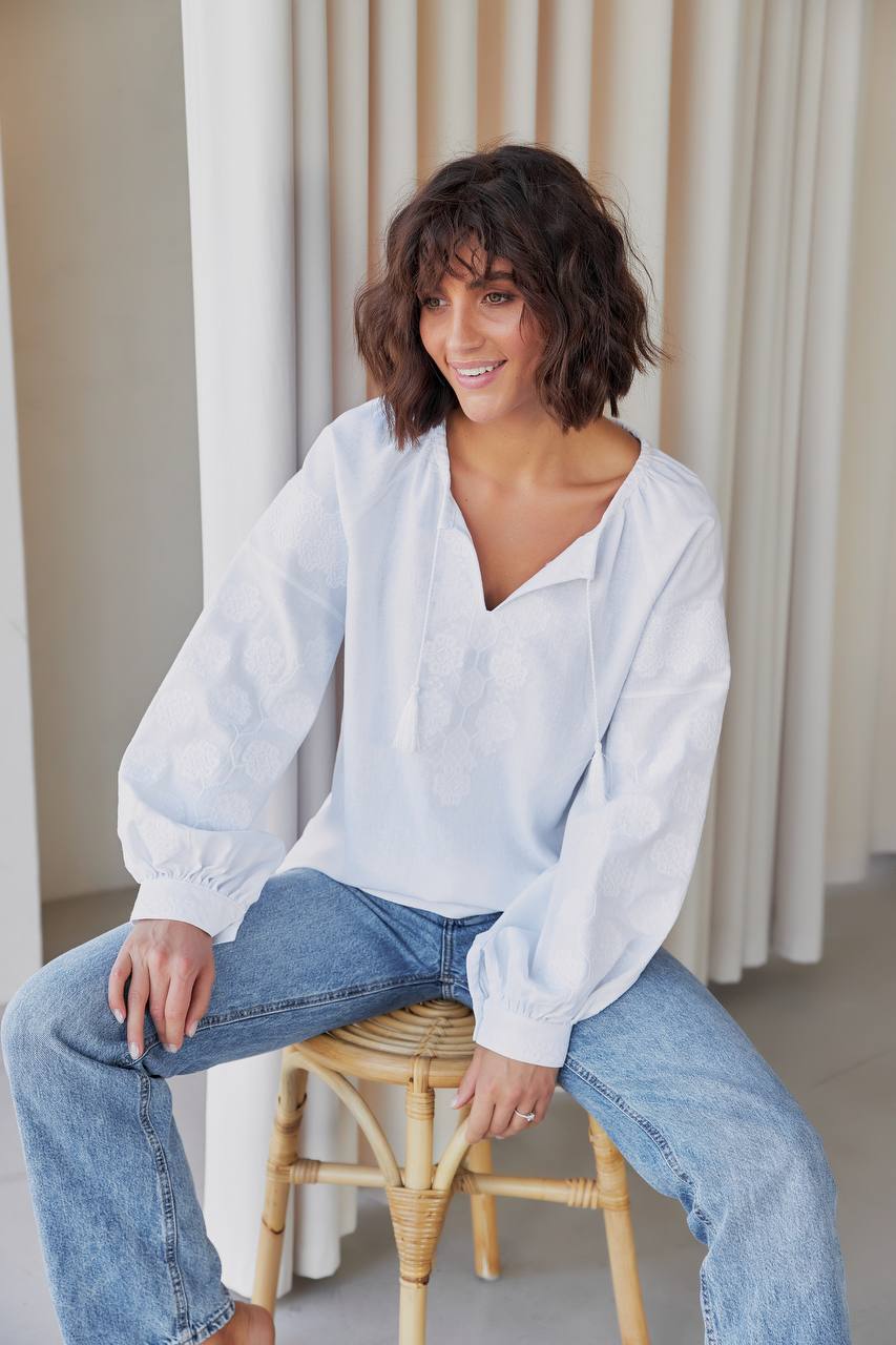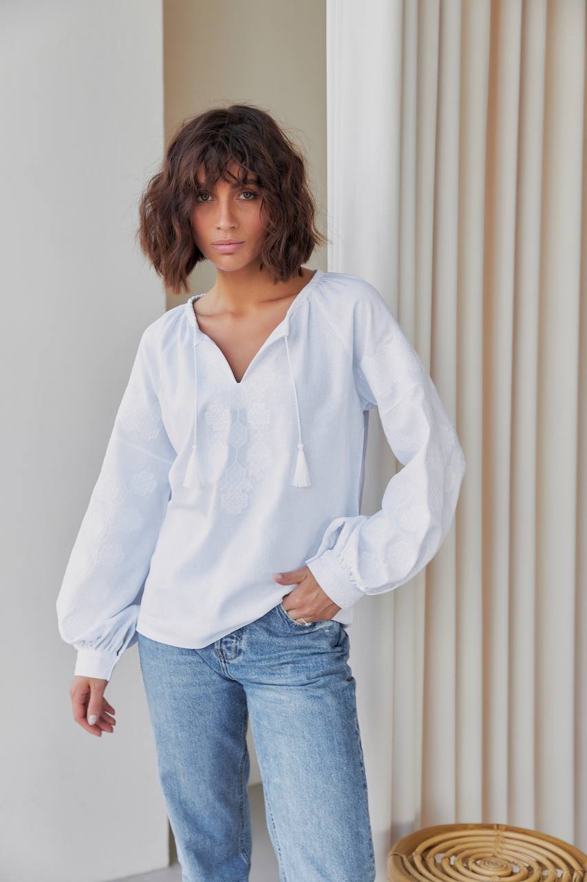 Жіноча вишиванка Бавовна (біла) виконана на льоні. Тип вишивки – хрестик.