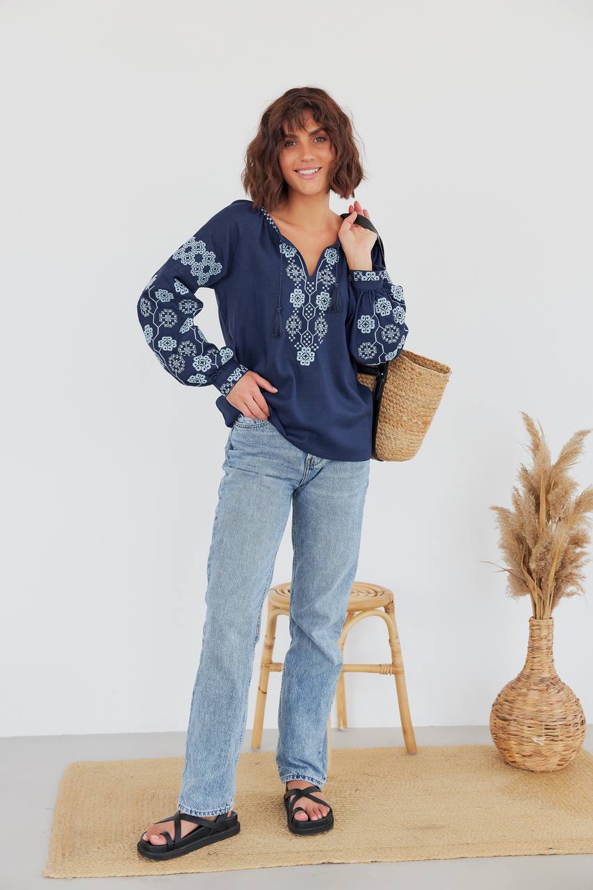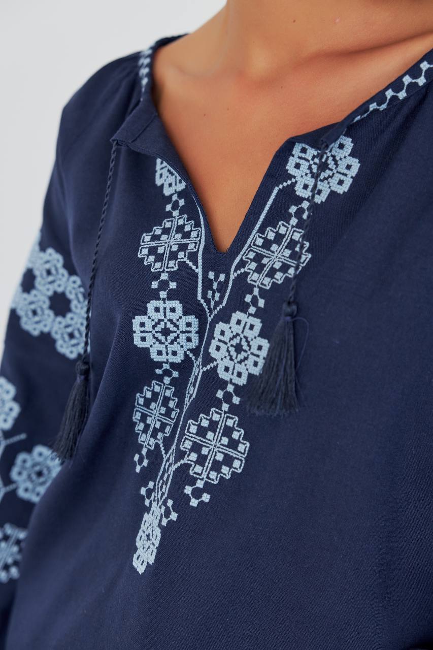 Жіноча вишиванка Бавовна (синя) виконана на льоні. Тип вишивки – хрестик.