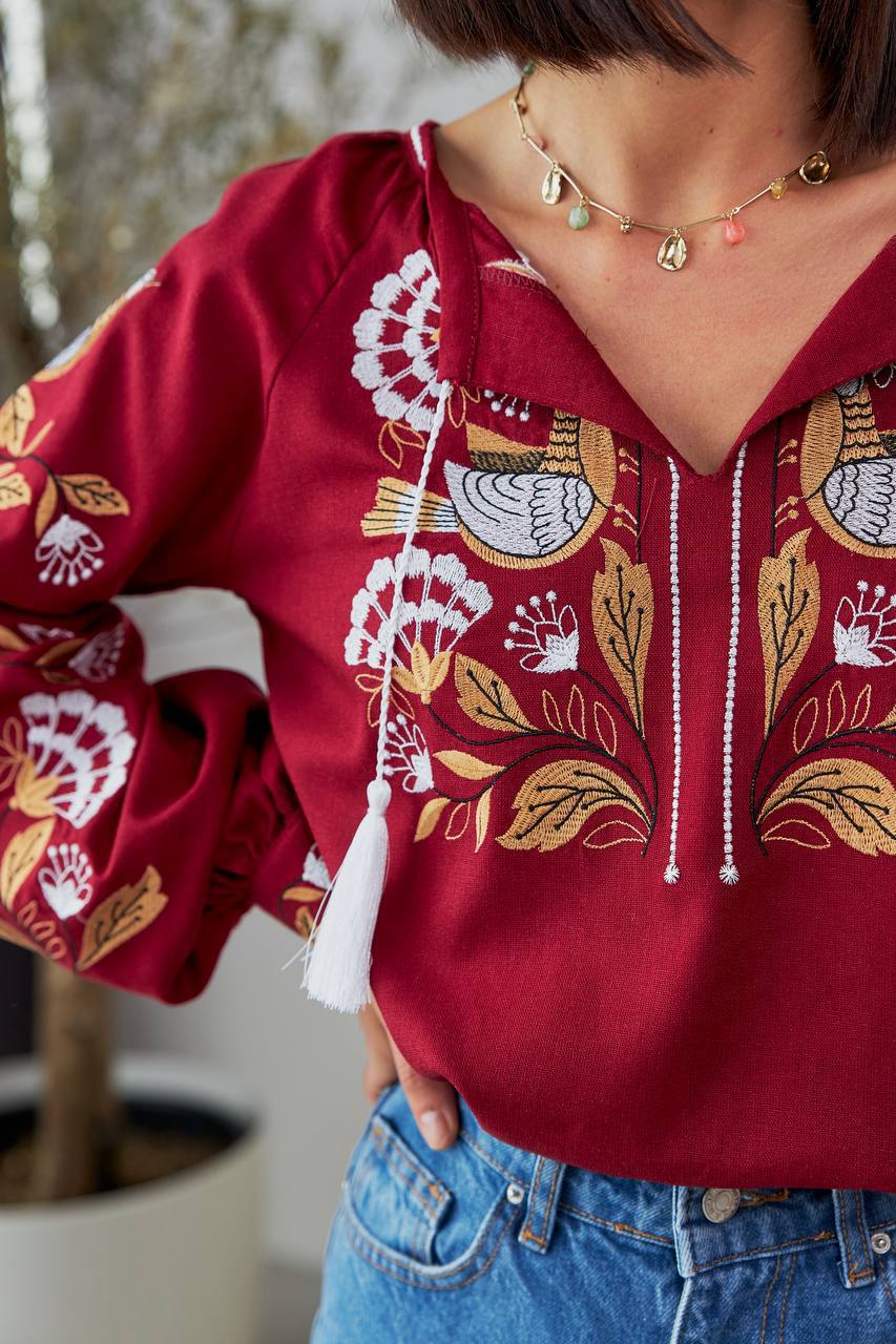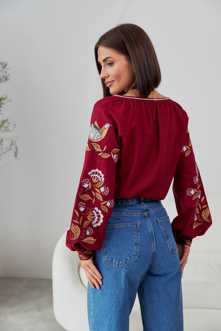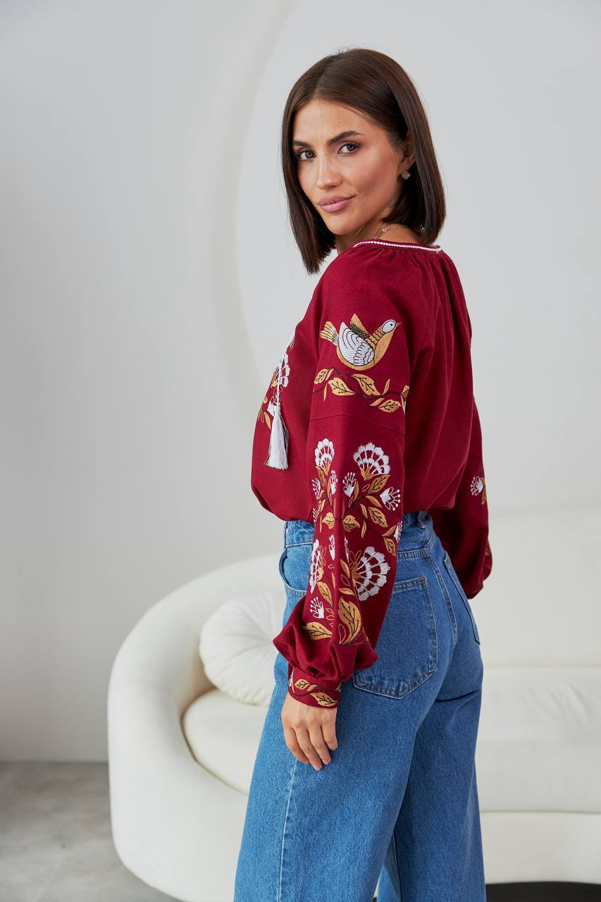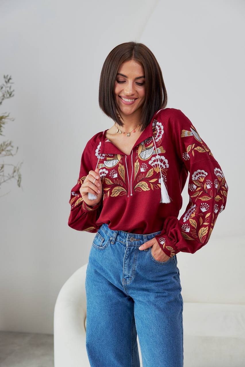 Жіноча вишиванка Дивоцвіт (бордо) виконана на натуральній тканині.