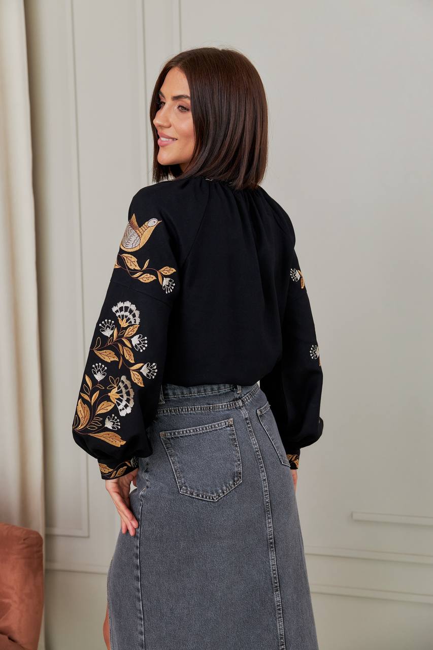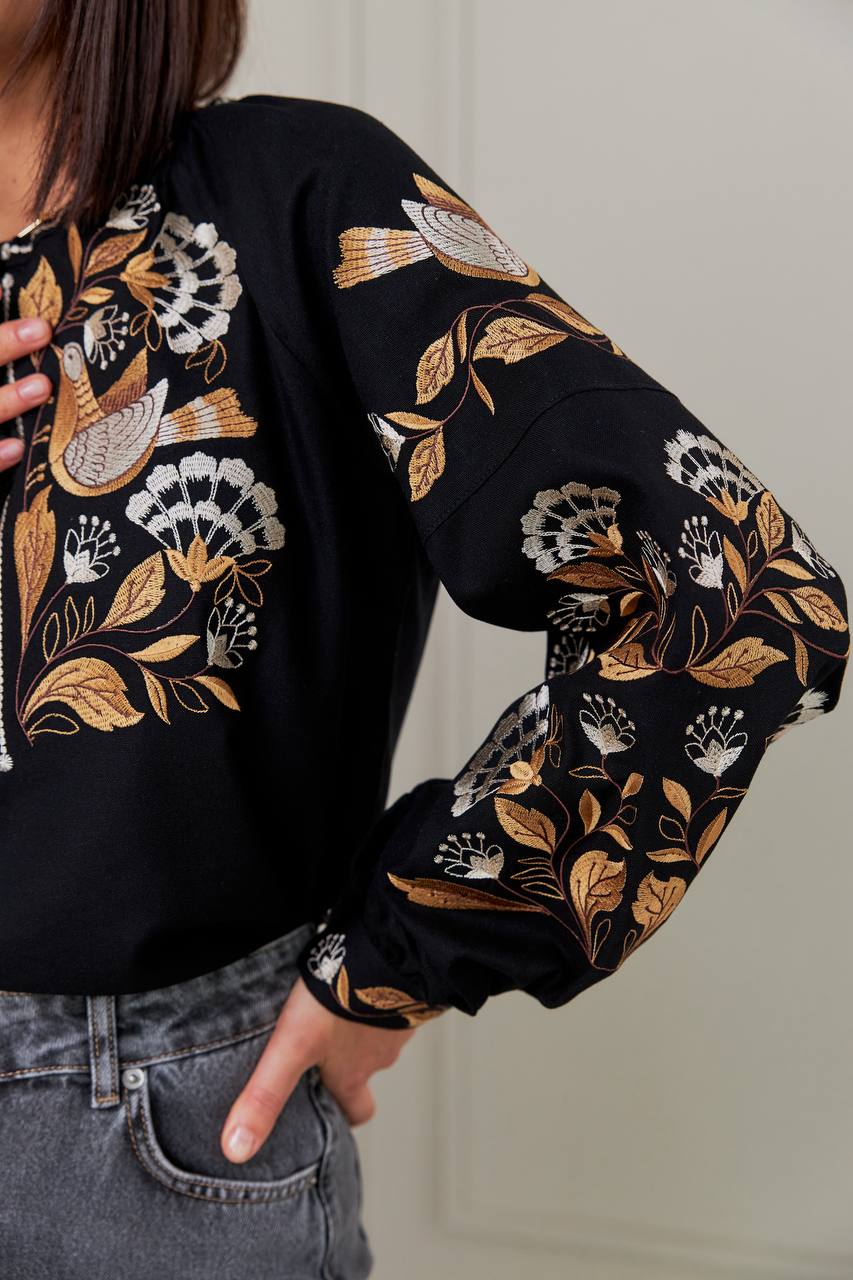 Жіноча вишиванка Дивоцвіт (чорна) виконана на натуральній тканині.