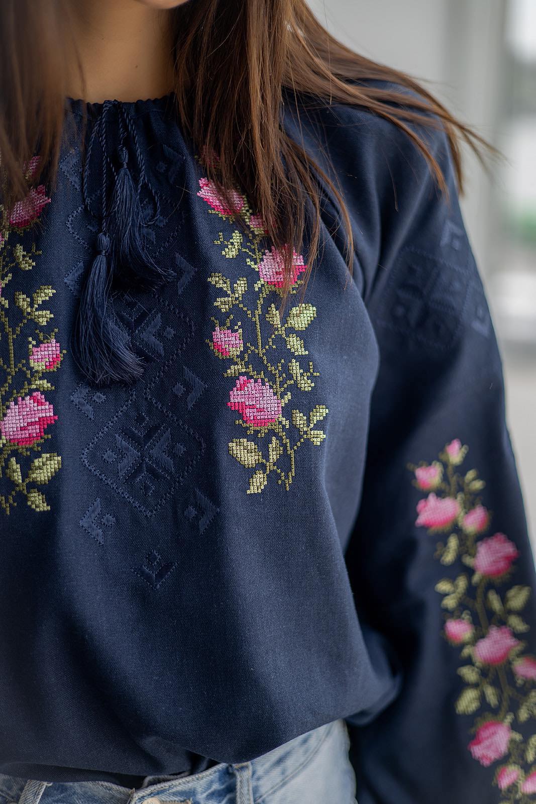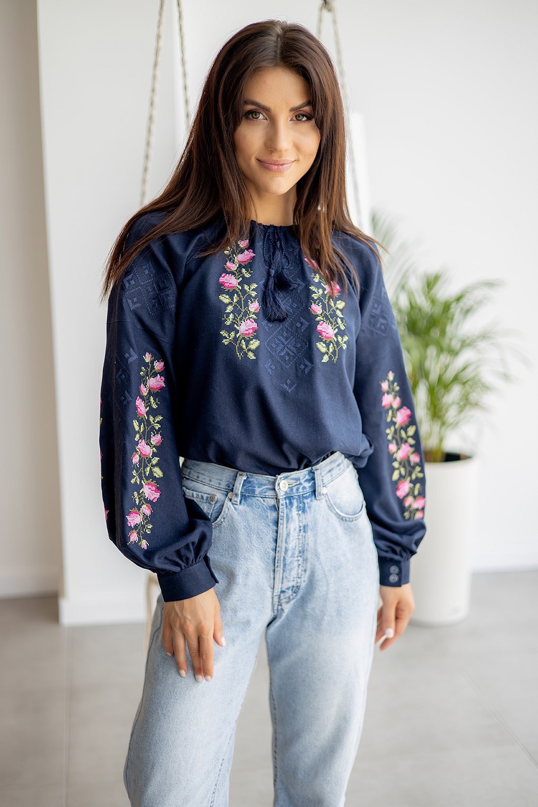 Жіноча вишиванка Діана (темно-синя) виконана на льоні, тип вишивки хрестиком. Легка в догляді, приємна до тіла