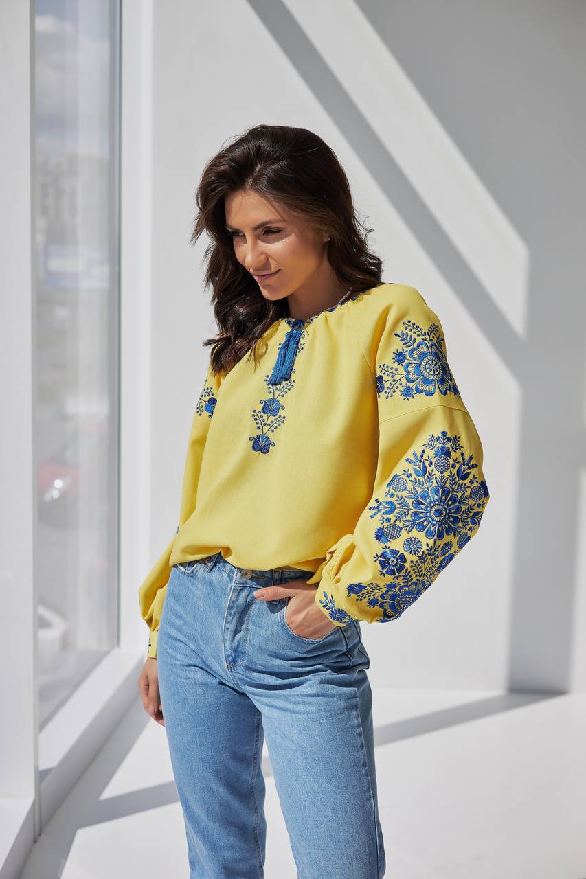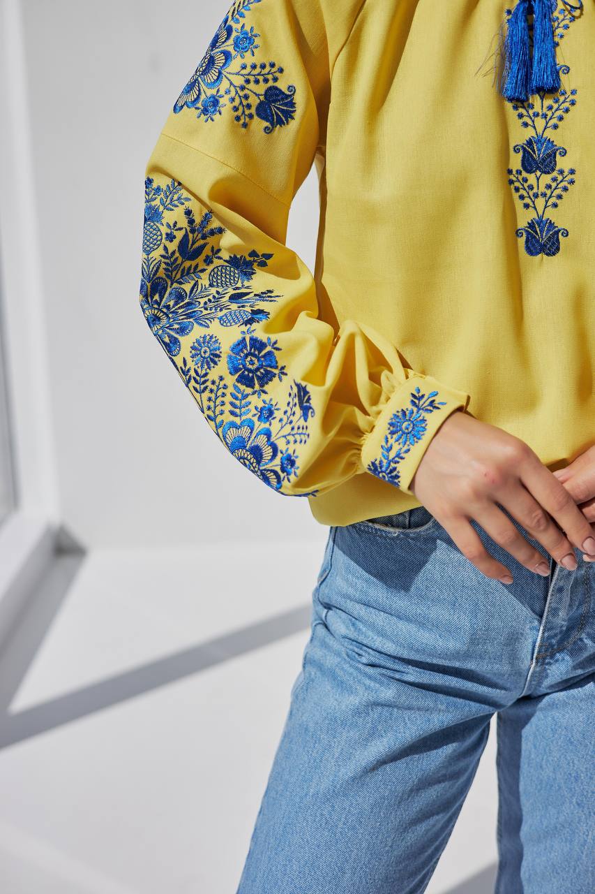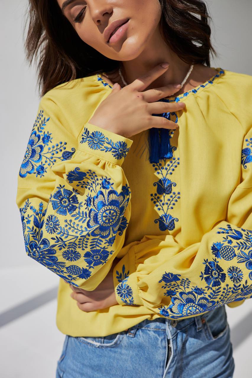 Жіноча вишиванка Квітана (Жовта) виконана на льоні, тип вишивки гладдю