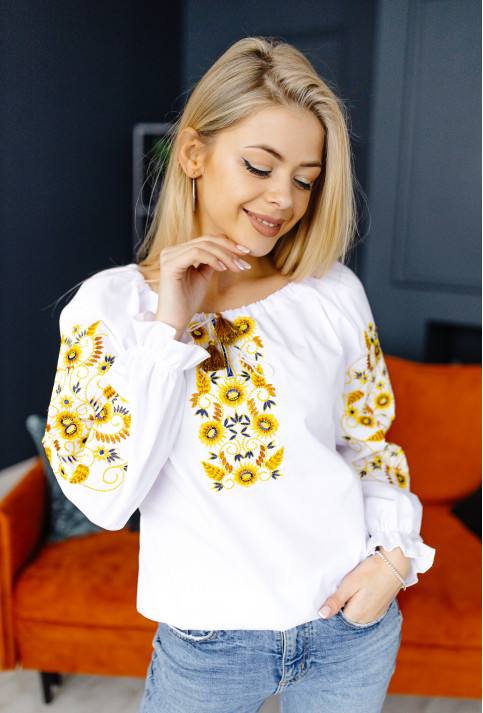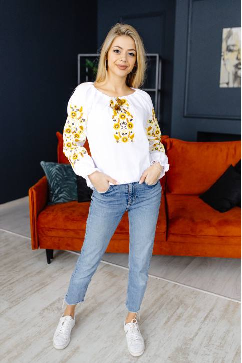 Жіноча вишиванка Вінок (біло-жовта) виконана на сорочковій тканині, тип вишивки гладдю. Легка в догляді, приємна до тіла