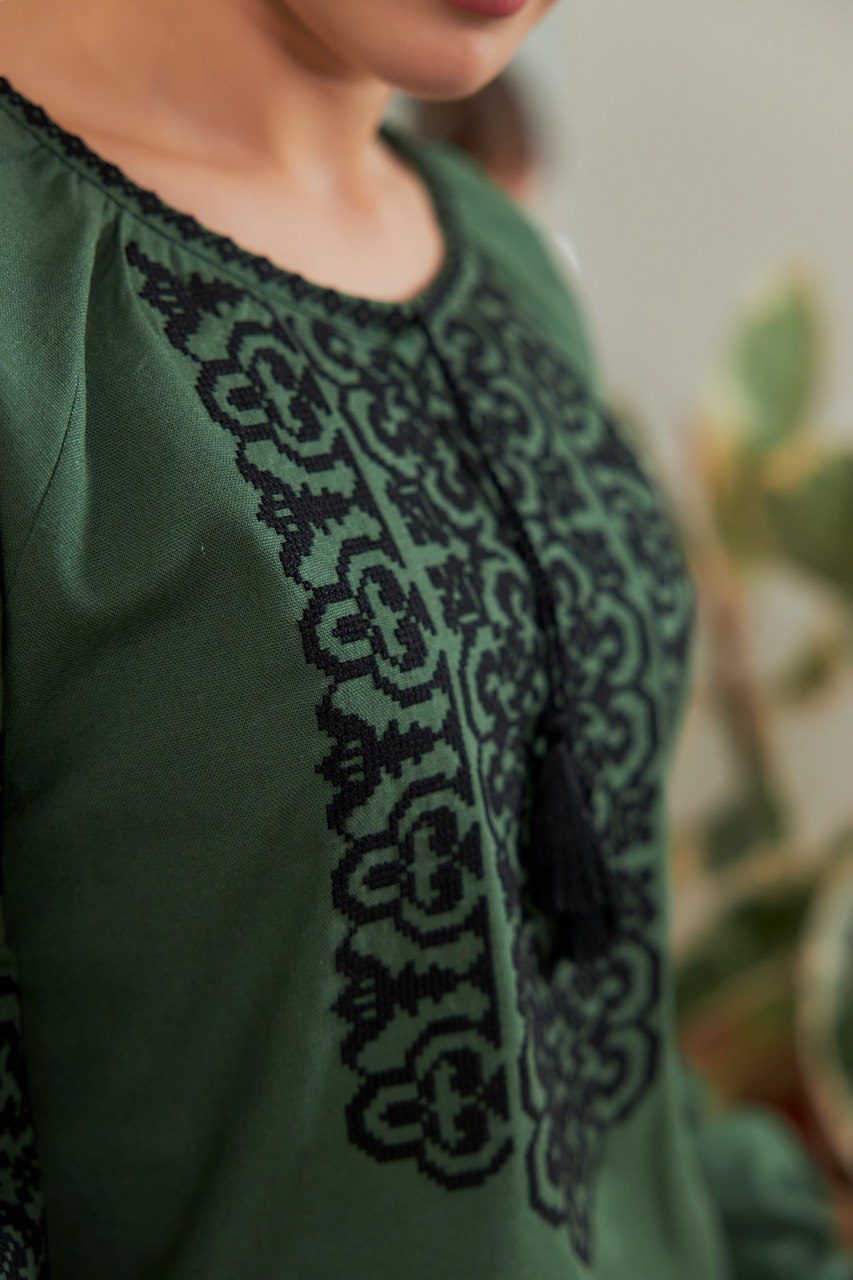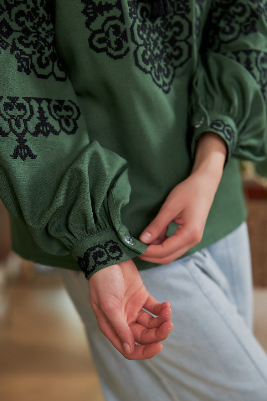 Жіноча вишиванка Козачка (зелена) виконана на натуральній тканині.