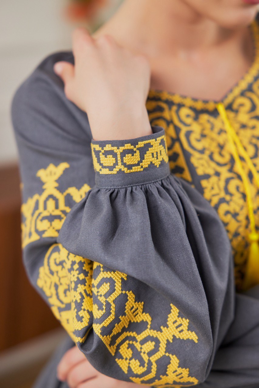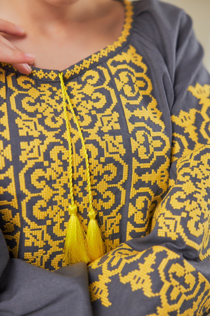 Жіноча вишиванка Козачка (сіро-жовта) виконана на натуральній тканині.