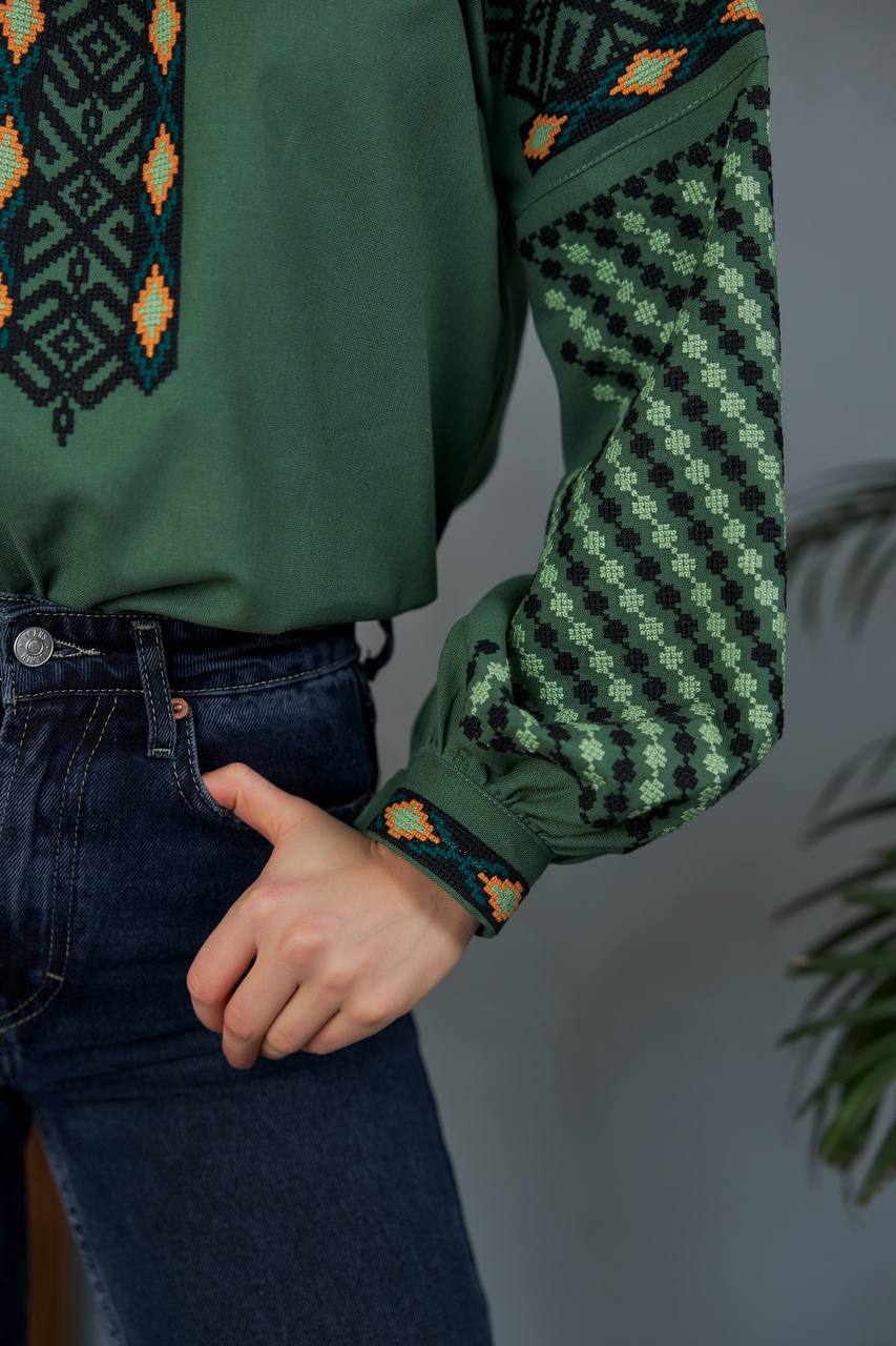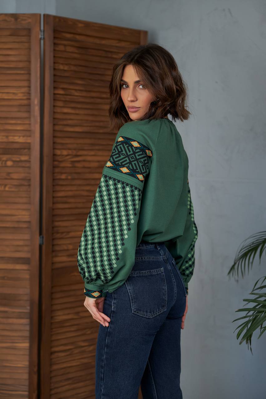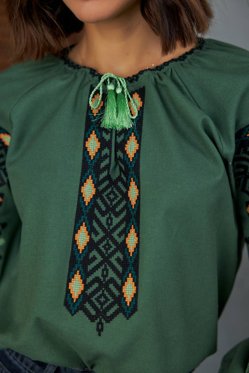 Жіноча вишиванка Колоритна (зелена) виконана на льоні. Тип вишивки – хрестик.