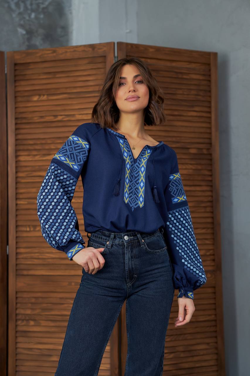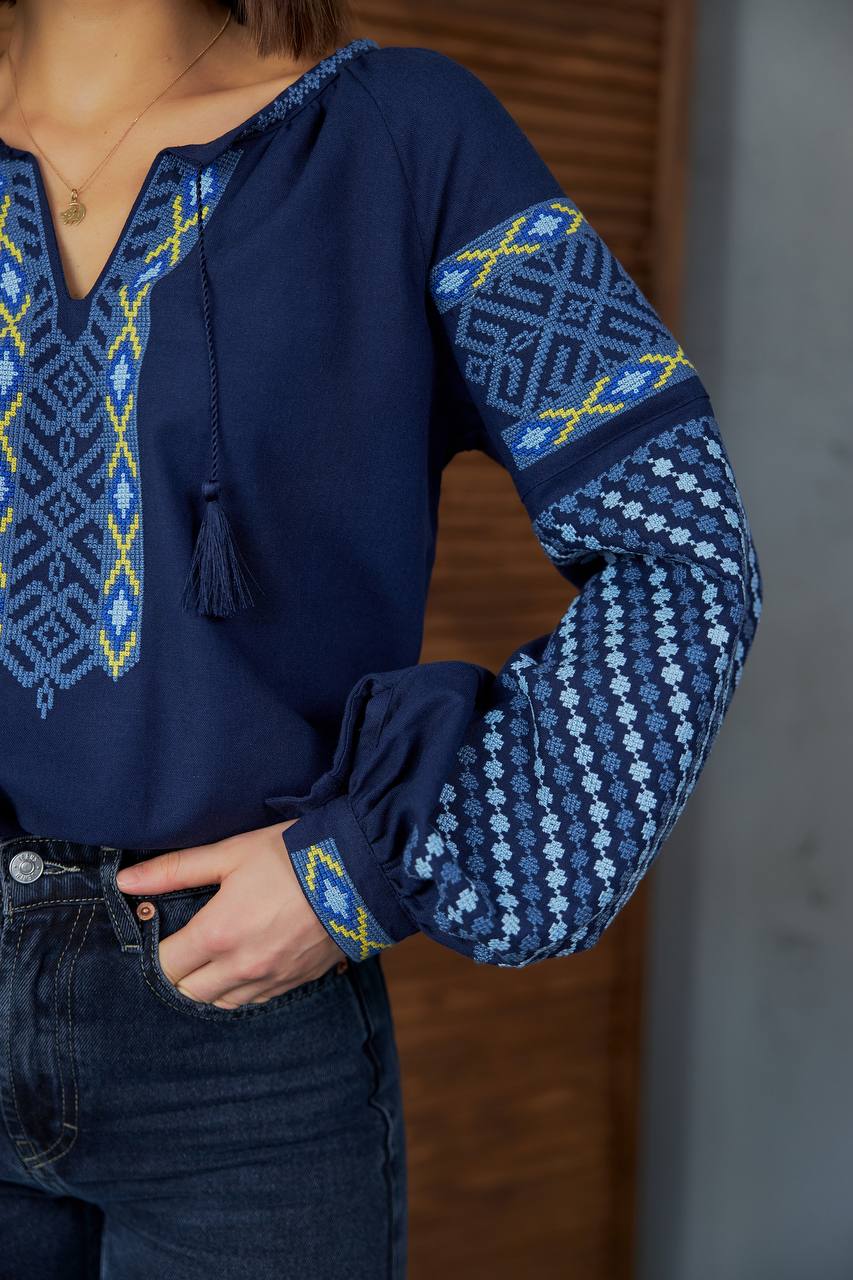 Жіноча вишиванка Колоритна (синя) виконана на льоні.