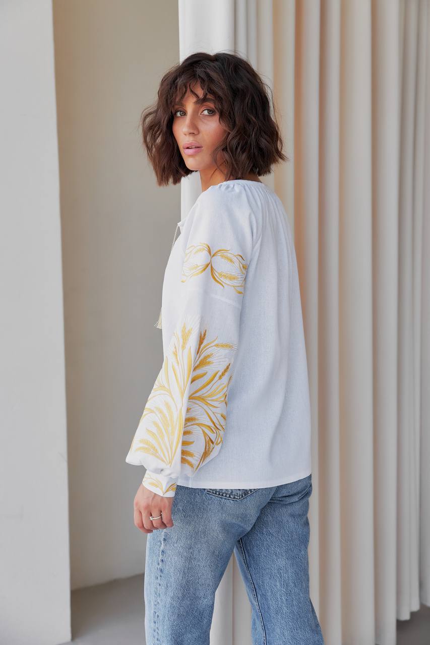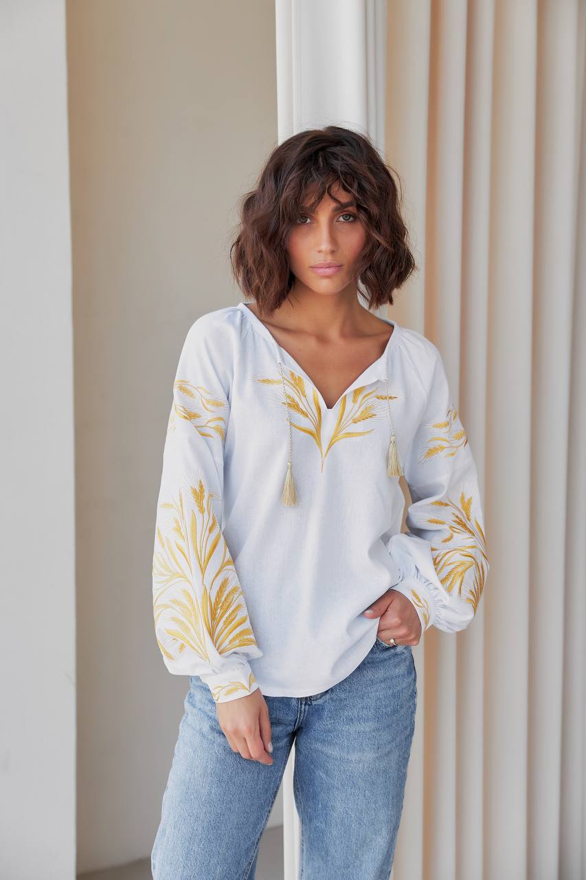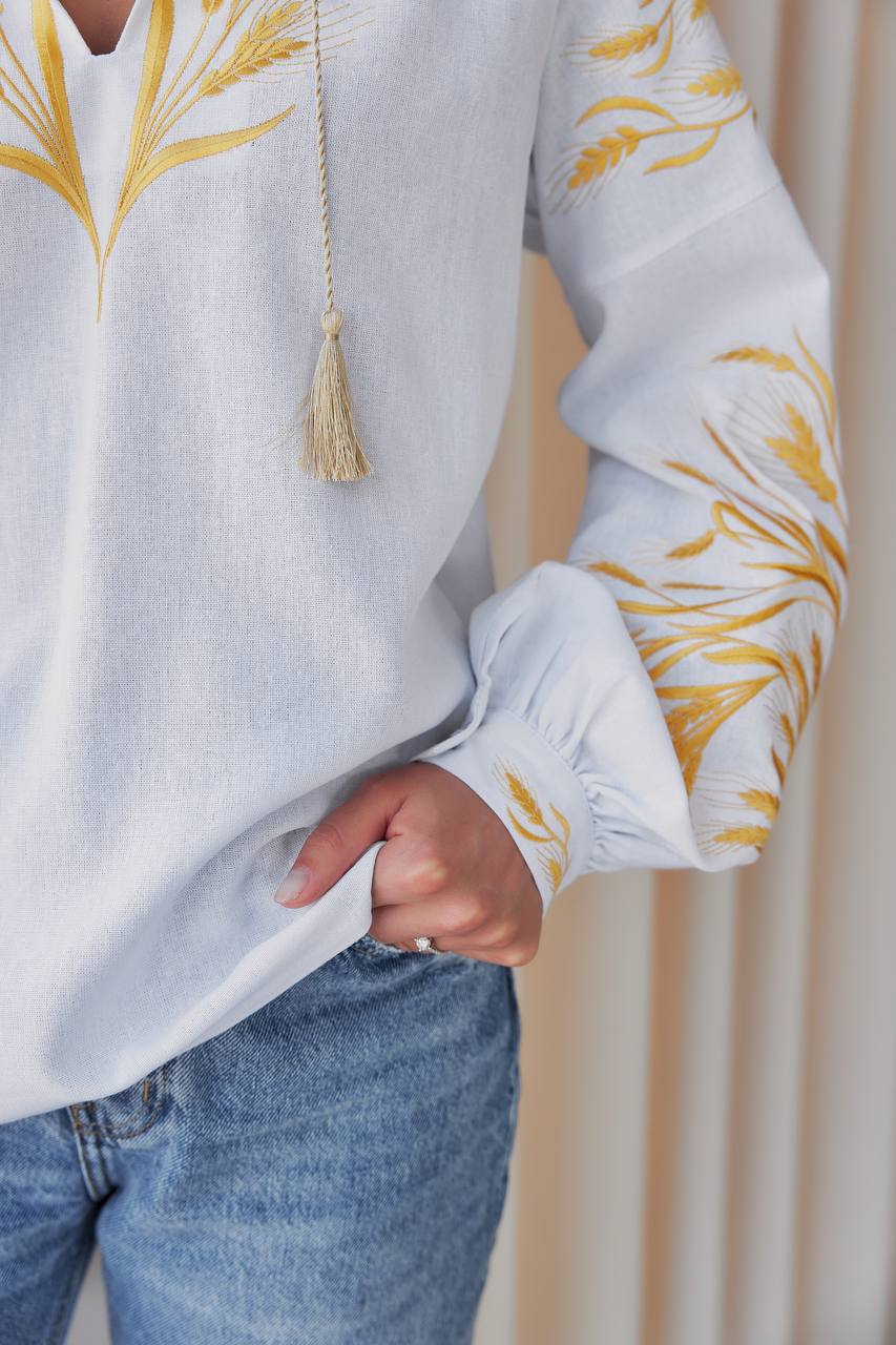 Жіноча вишиванка Колосся (біла) виконана на льоні.