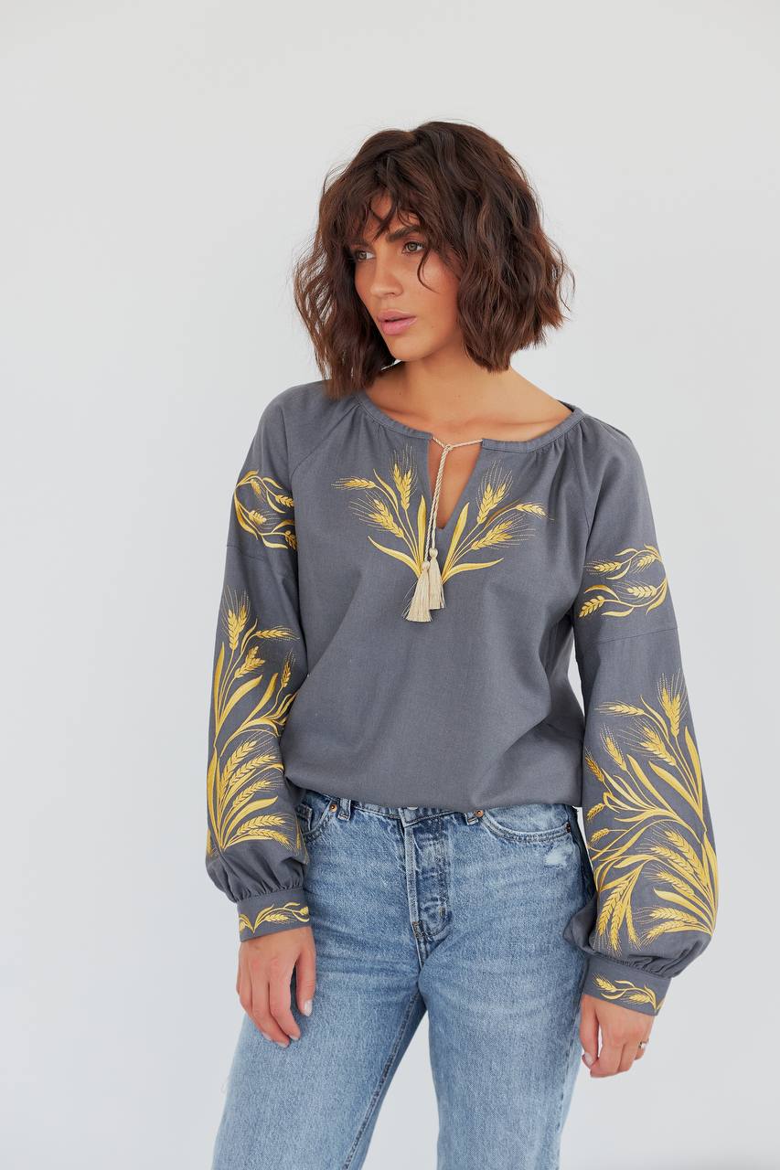 Жіноча вишиванка Колосся (сіра) виконана на льоні.