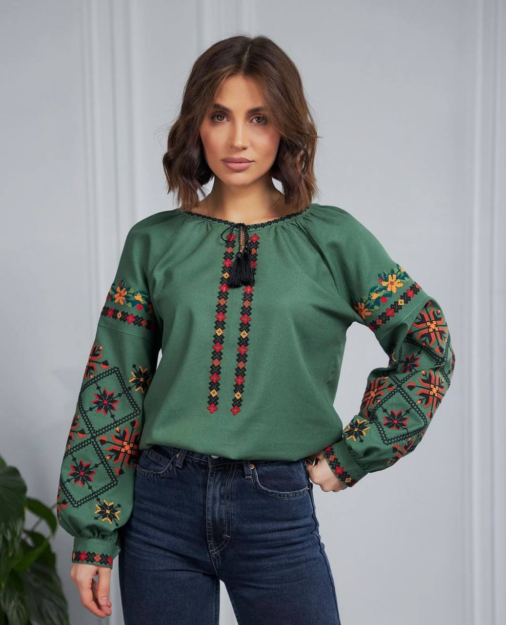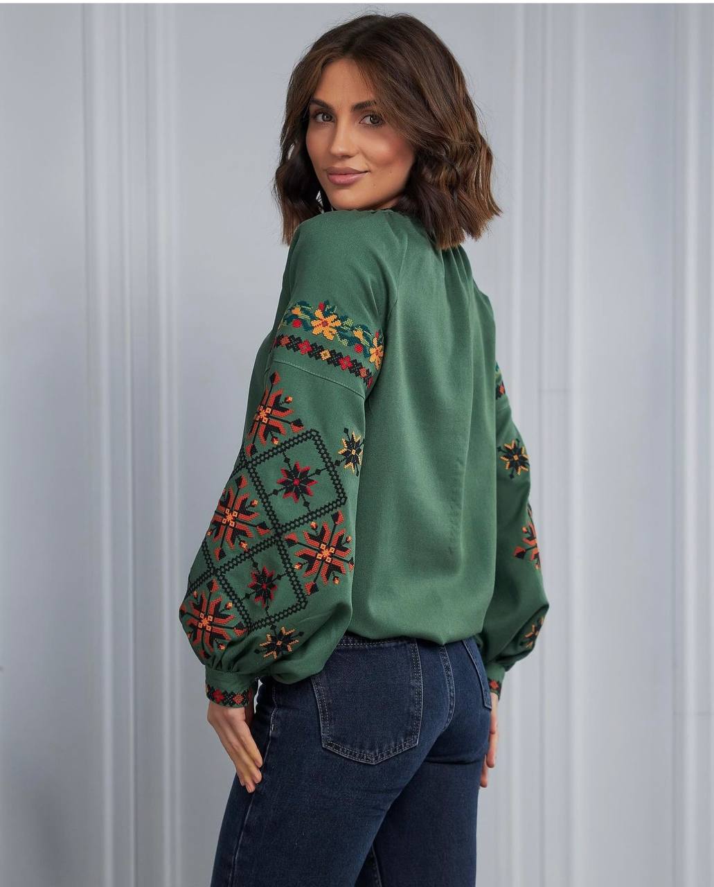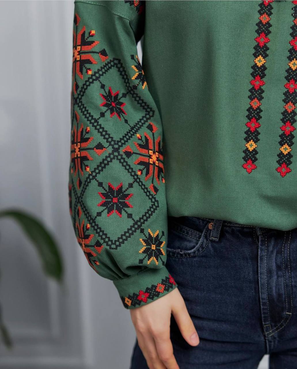 Жіноча вишиванка Нескорена (зелена) виконана на льоні.
