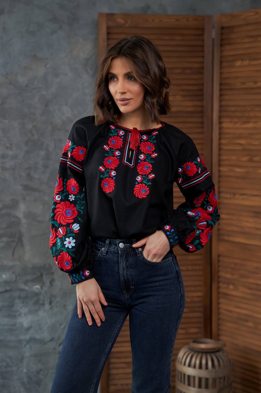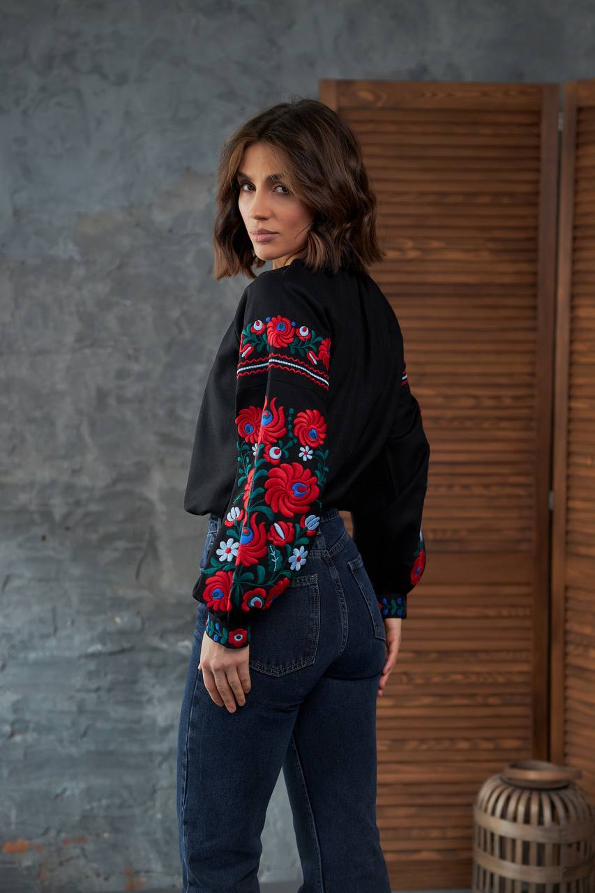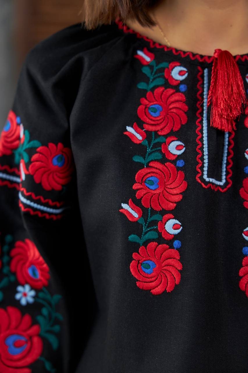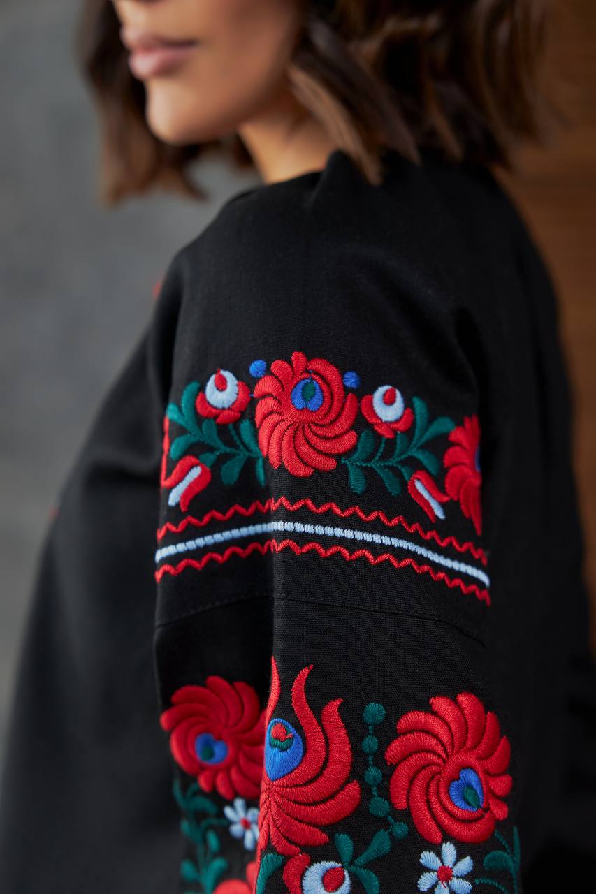 Жіноча вишиванка Петриківка (чорна) виконана на льоні.