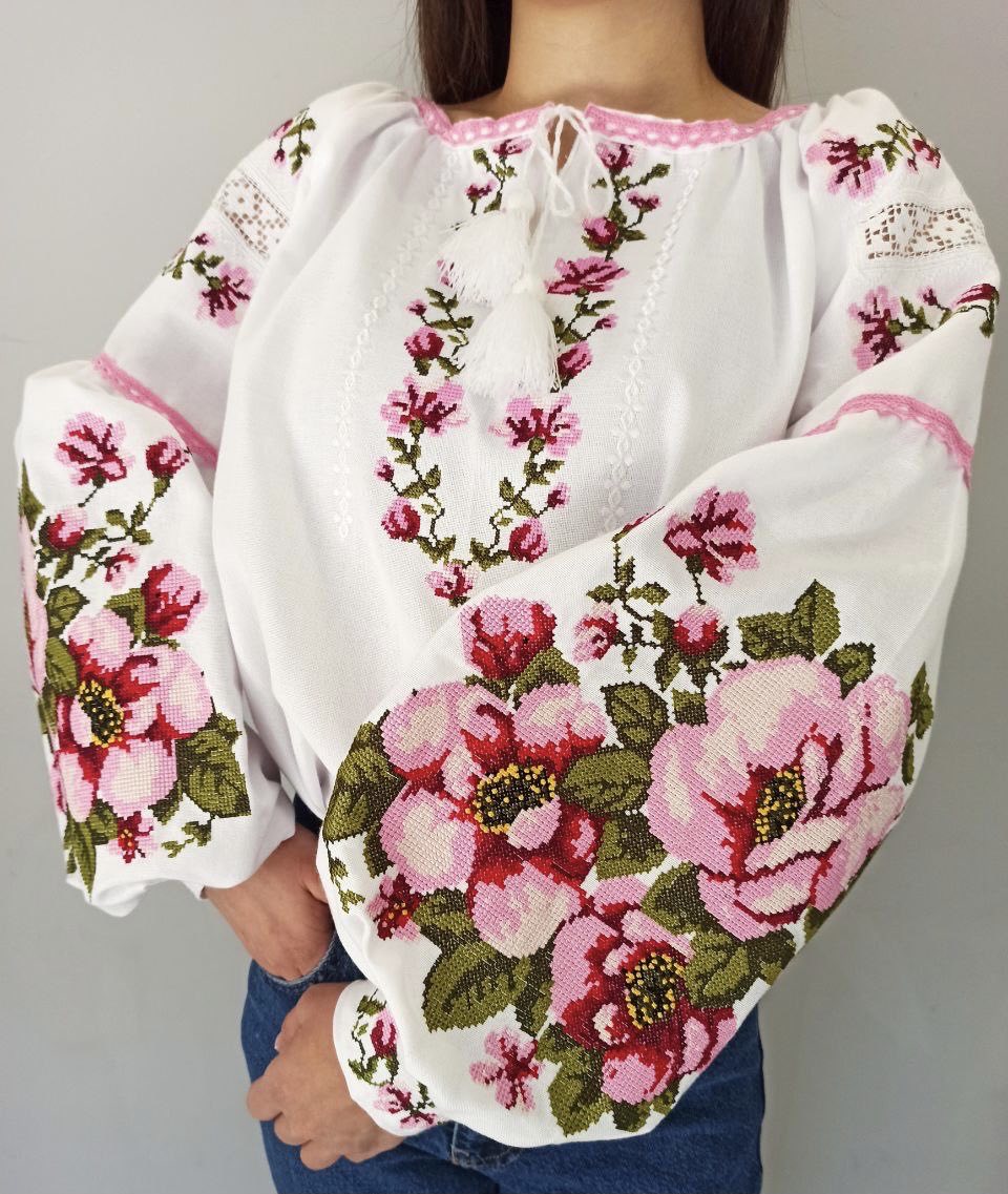 Жіноча вишиванка Рожеві Троянди (біло-рожева) виконана на натуральній тканині домоткане полотно, тип вишивки хрестиком.