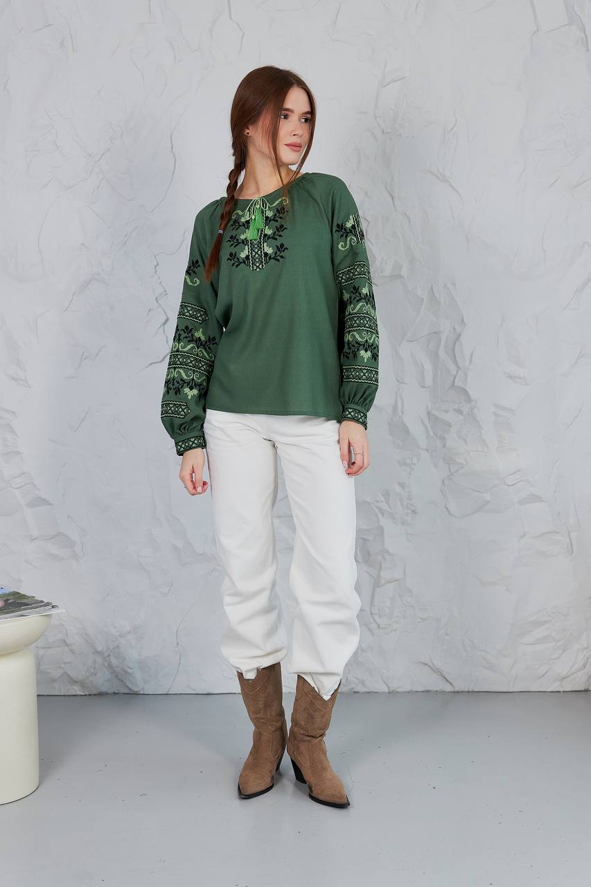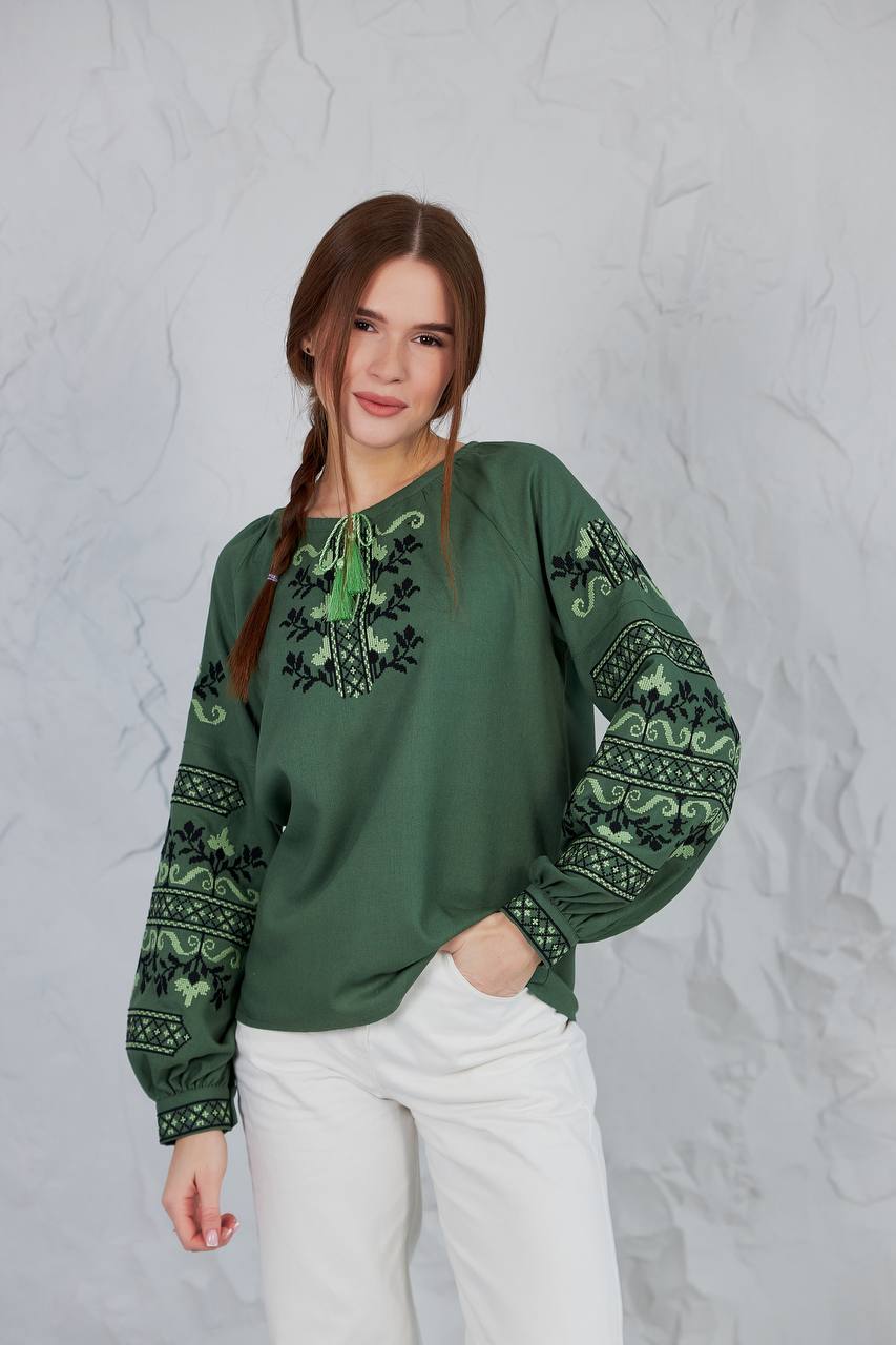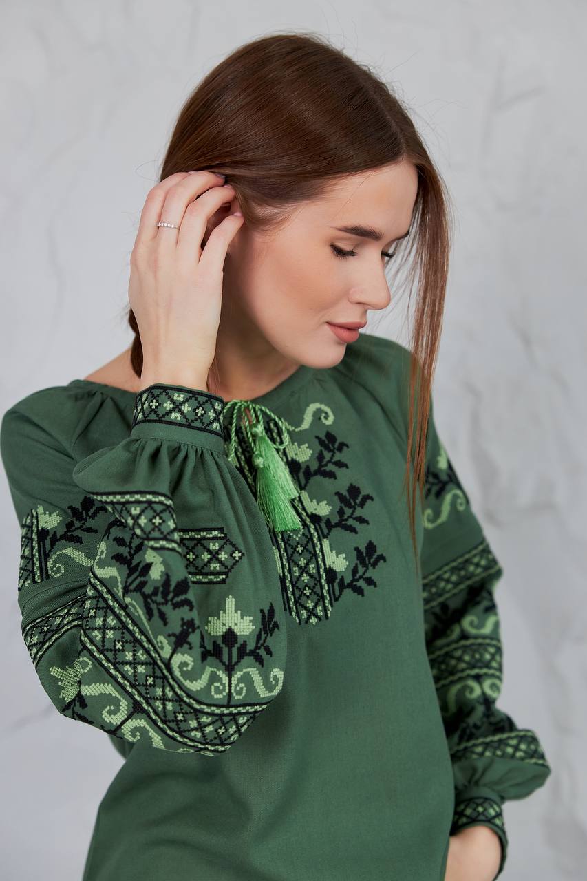Жіноча вишиванка Стожари (хакі) виконана на натуральній тканині.