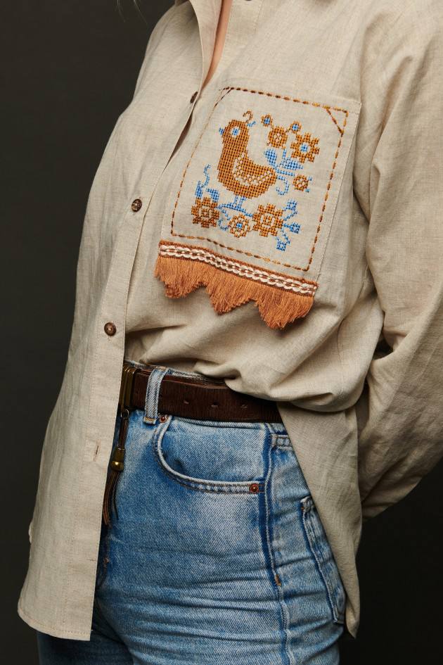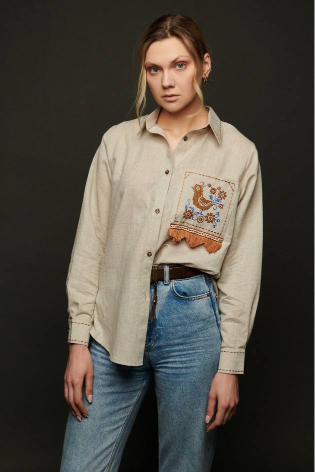 Жіноча вишиванка Сіла птаха (бежева) виконана на льоні.
