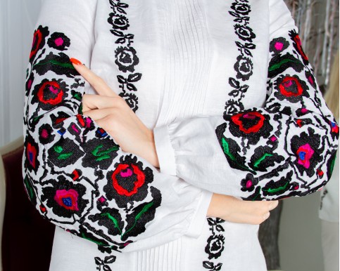 Жіноча вишиванка Іларія (біло-чорна) виконана на льоні, тип вишивки гладдю