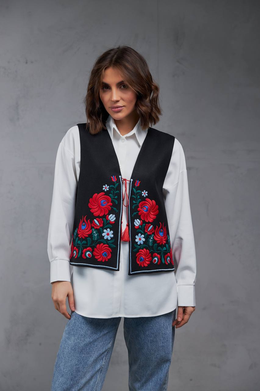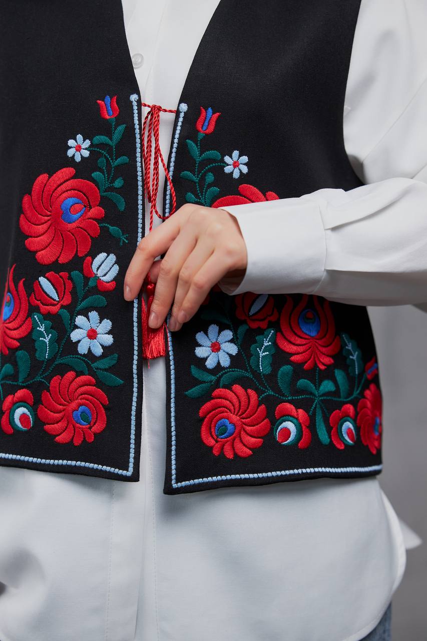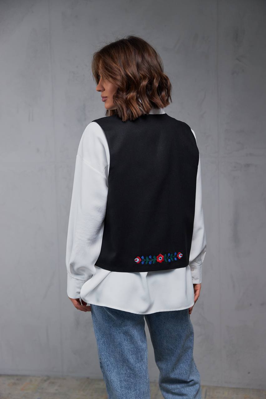 Жіноча вишита жилетка Петриківка (чорна) виконана на льоні.