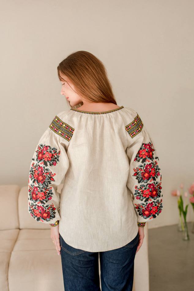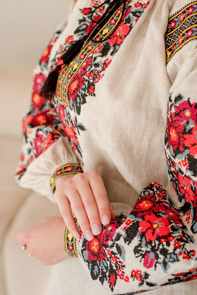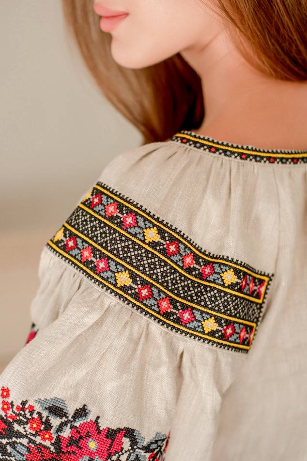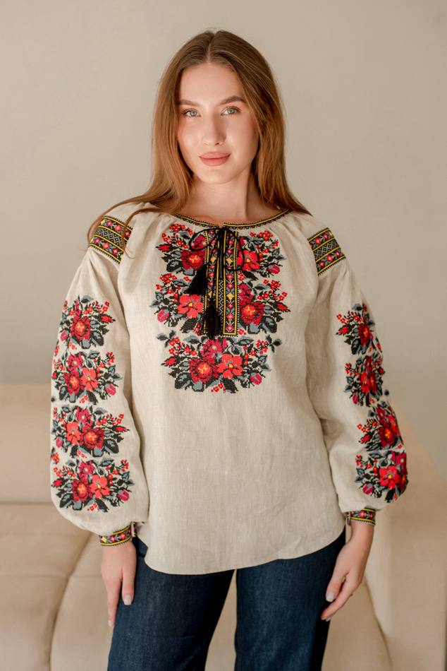 Жіноча вишита сорочка Борщівська (беж)  виконана на натуральному  льоні