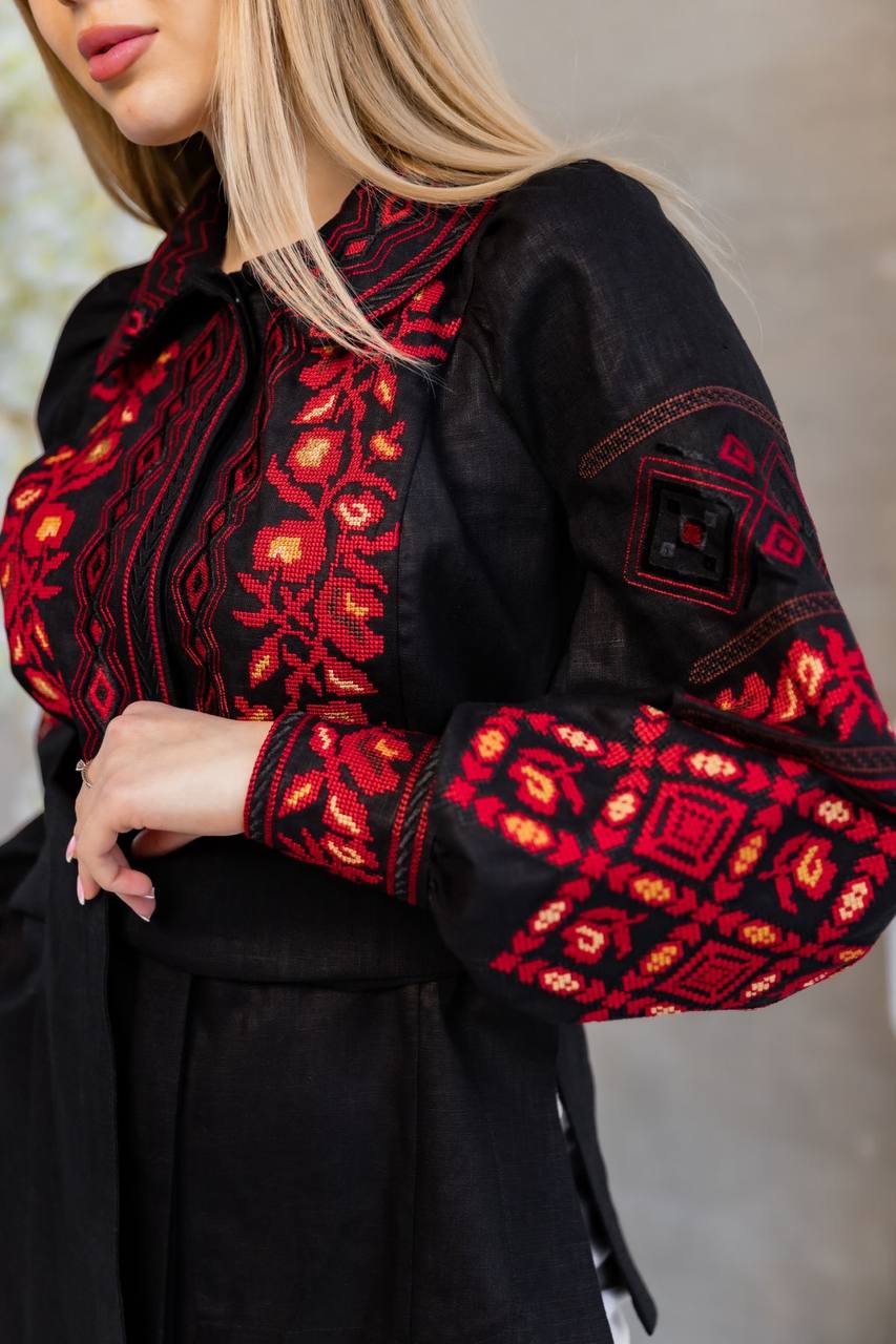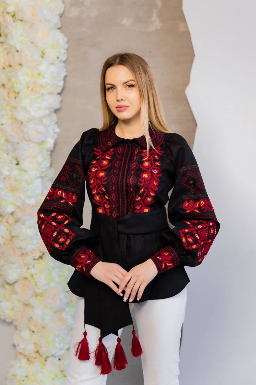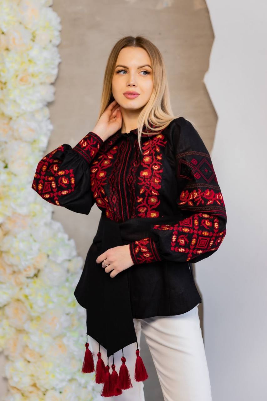 Жіноча вишита сорочка Мирослава (чорна з червоним) виконана на натуральній тканині.