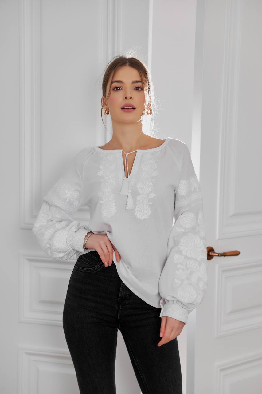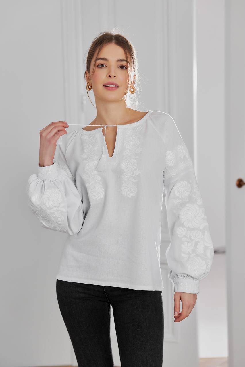 Жіноча вишита сорочка Петриківка (біла) виконана на льоні.