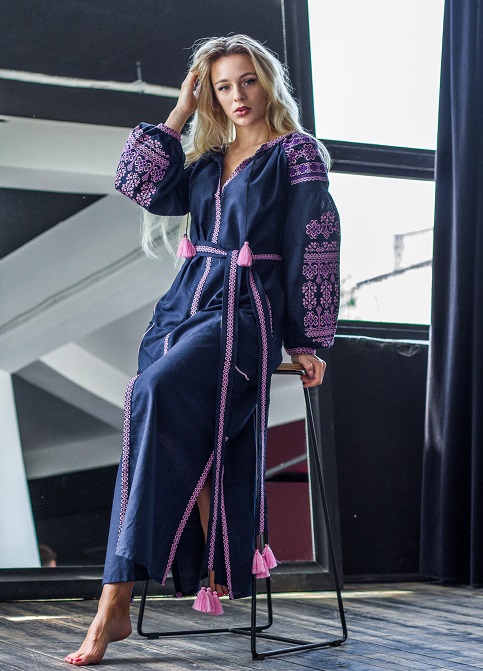 Жіноча вишита сукня Злата (темно-синя) виконана на льоні. Тип вишивки – хрестик