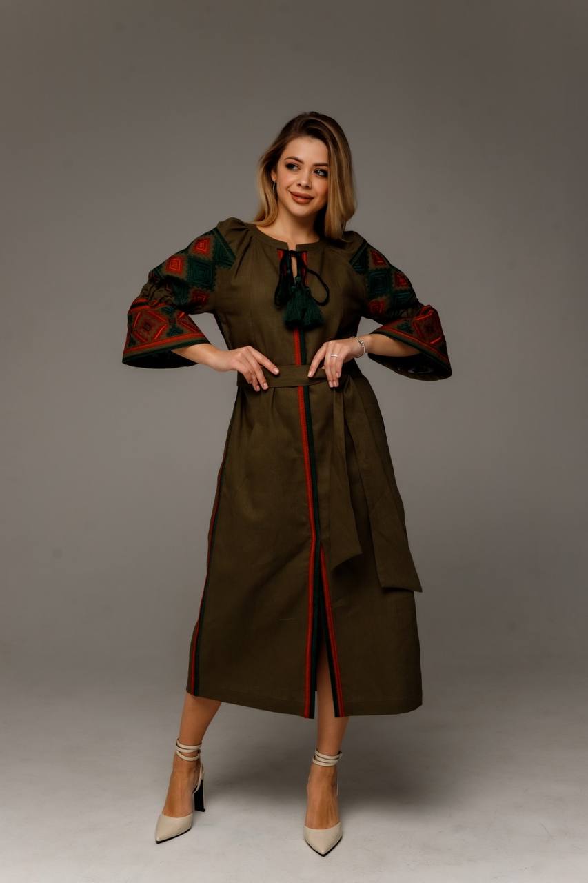 Жіноча вишита сукня Доля (хакі) виконана на натуральній тканині.