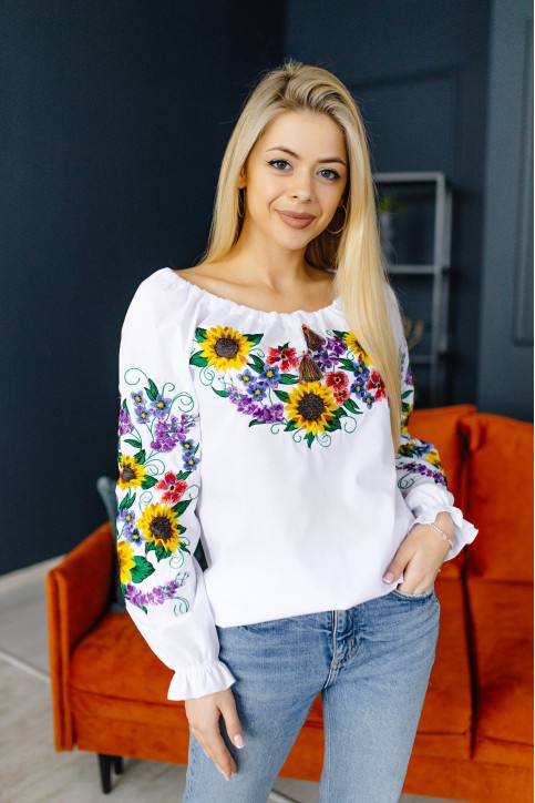 Жіноча вишиванка Агата (біла) виконана на сорочковій тканині, тип вишивки гладдю
