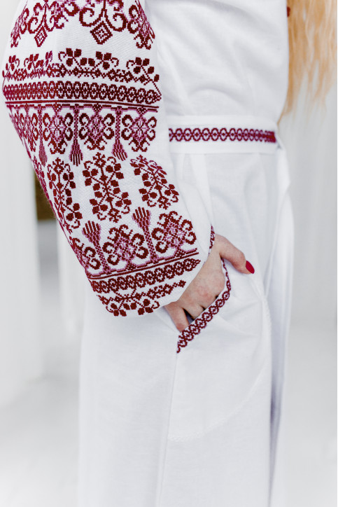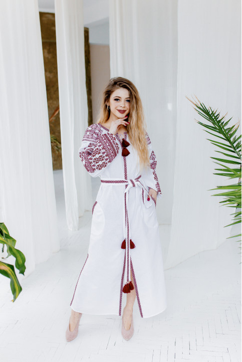 Жіноча сукня Злата (біло-червона) виконана на натуральній тканині домоткане полотно, тип вишивки хрестиком.