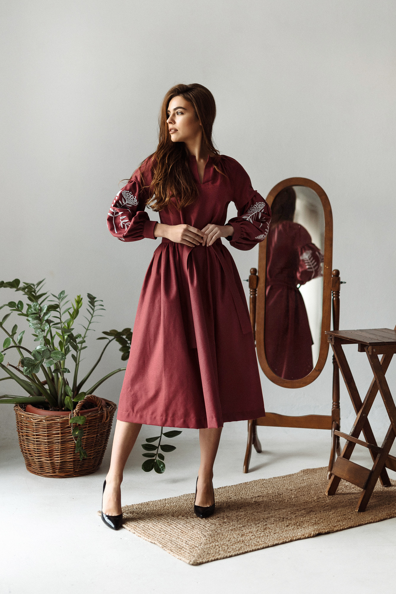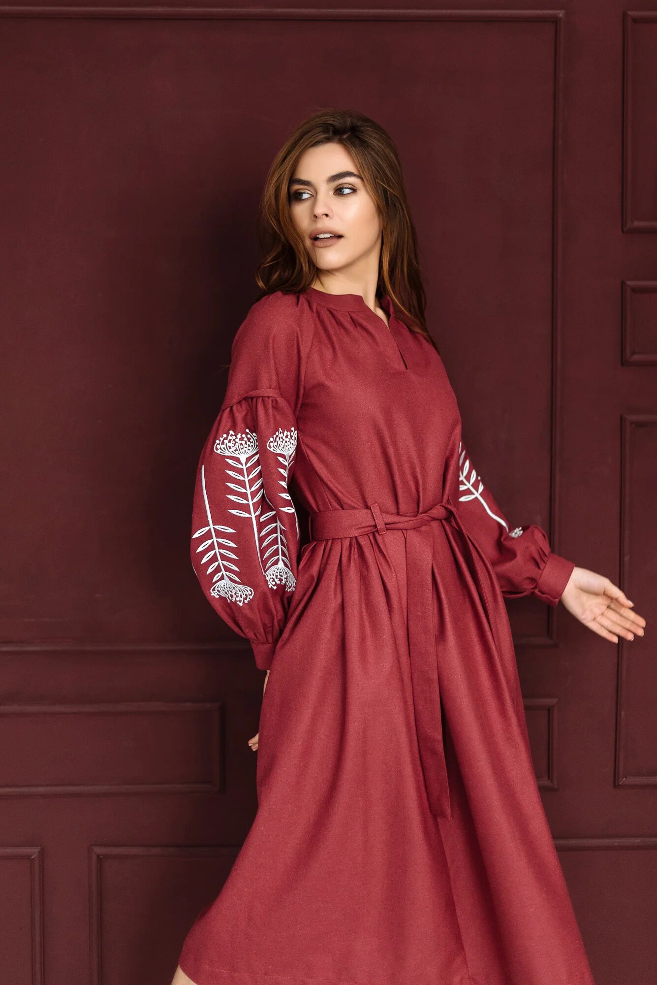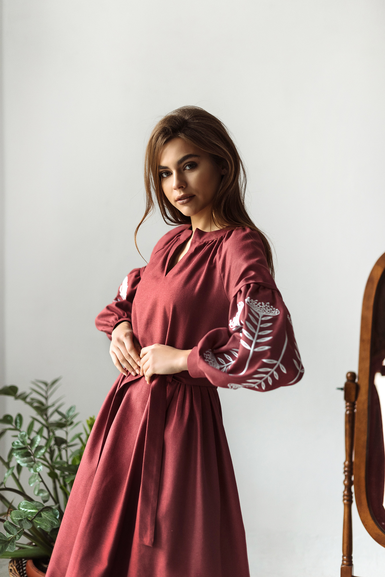 Жіноча сукня Магдалена (бордова) виконана на льоні, тип вишивки гладдю. Дану модель шиємо на замовлення, термін пошиття 10 днів.