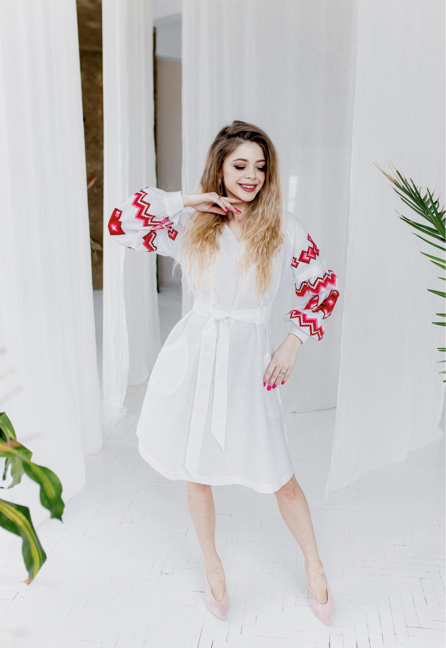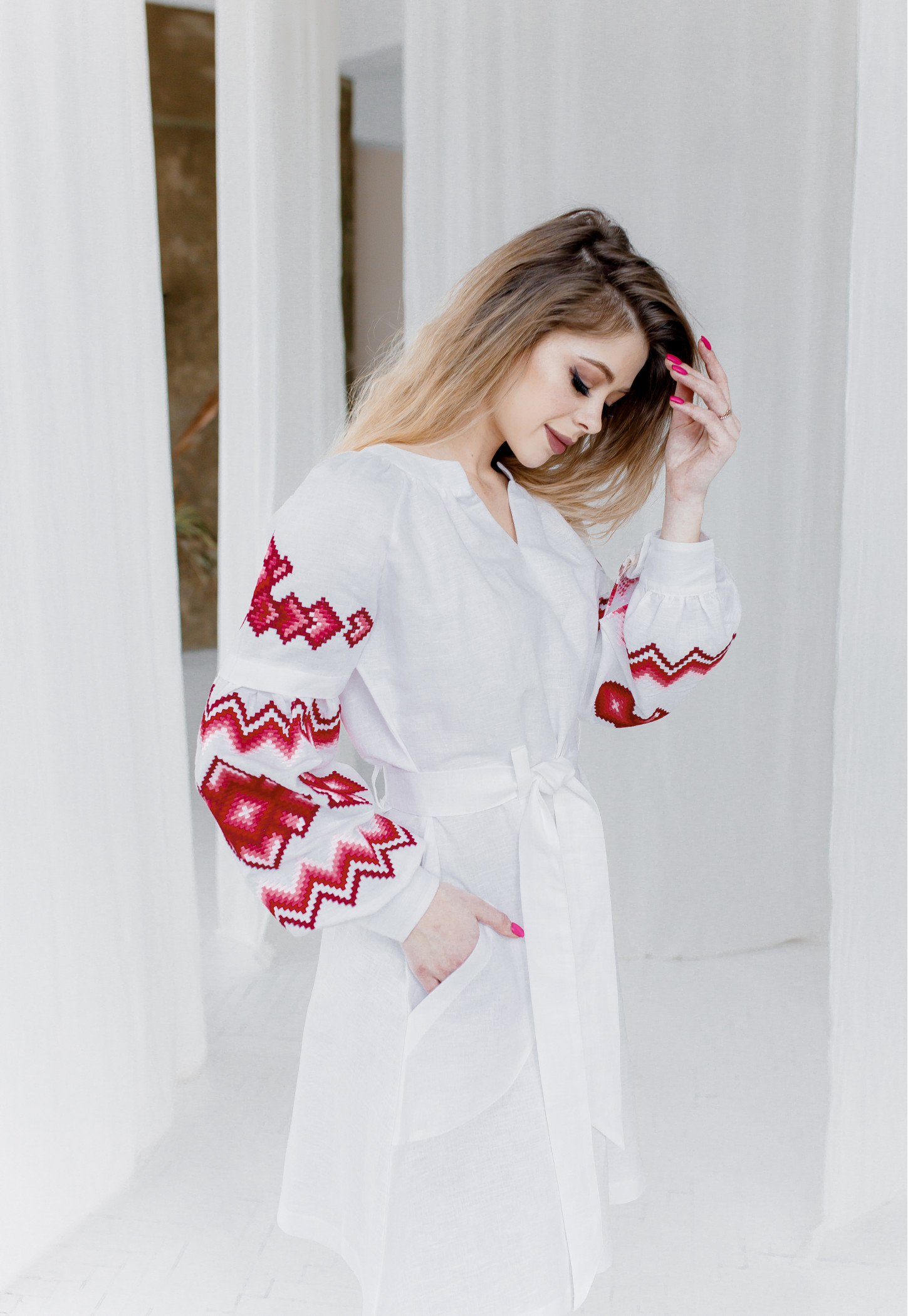 Жіноча сукня Христина (біло-червона)  виконана на льоні, тип вишивки гладдю. Легка в догляді, приємна до тіла
