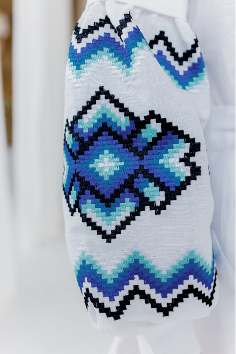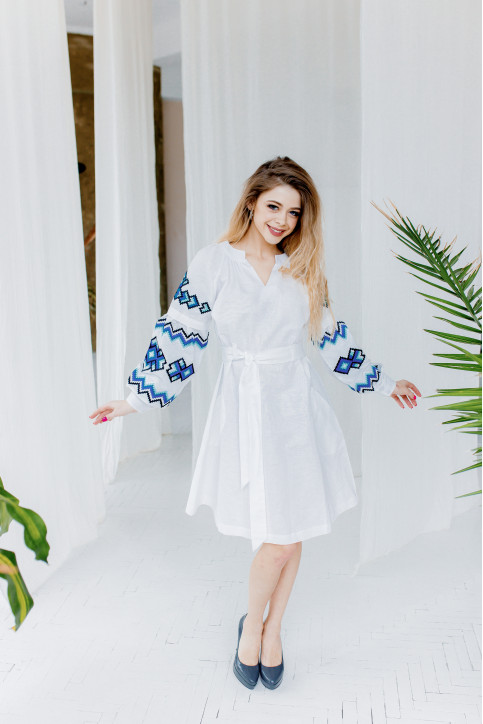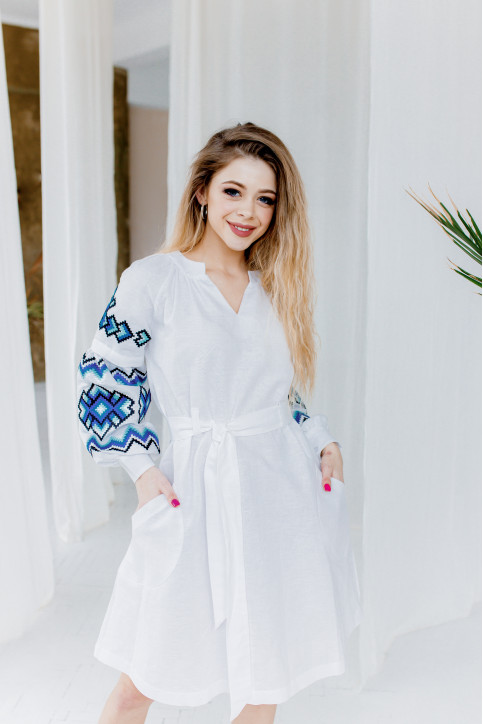 Жіноча сукня Христина (біло-синя) виконана на льоні, тип вишивки гладдю