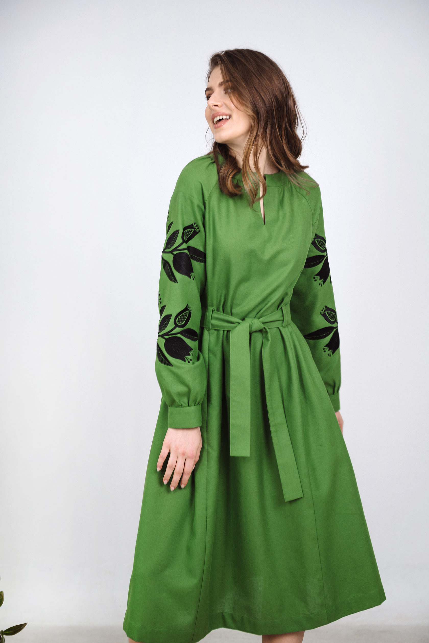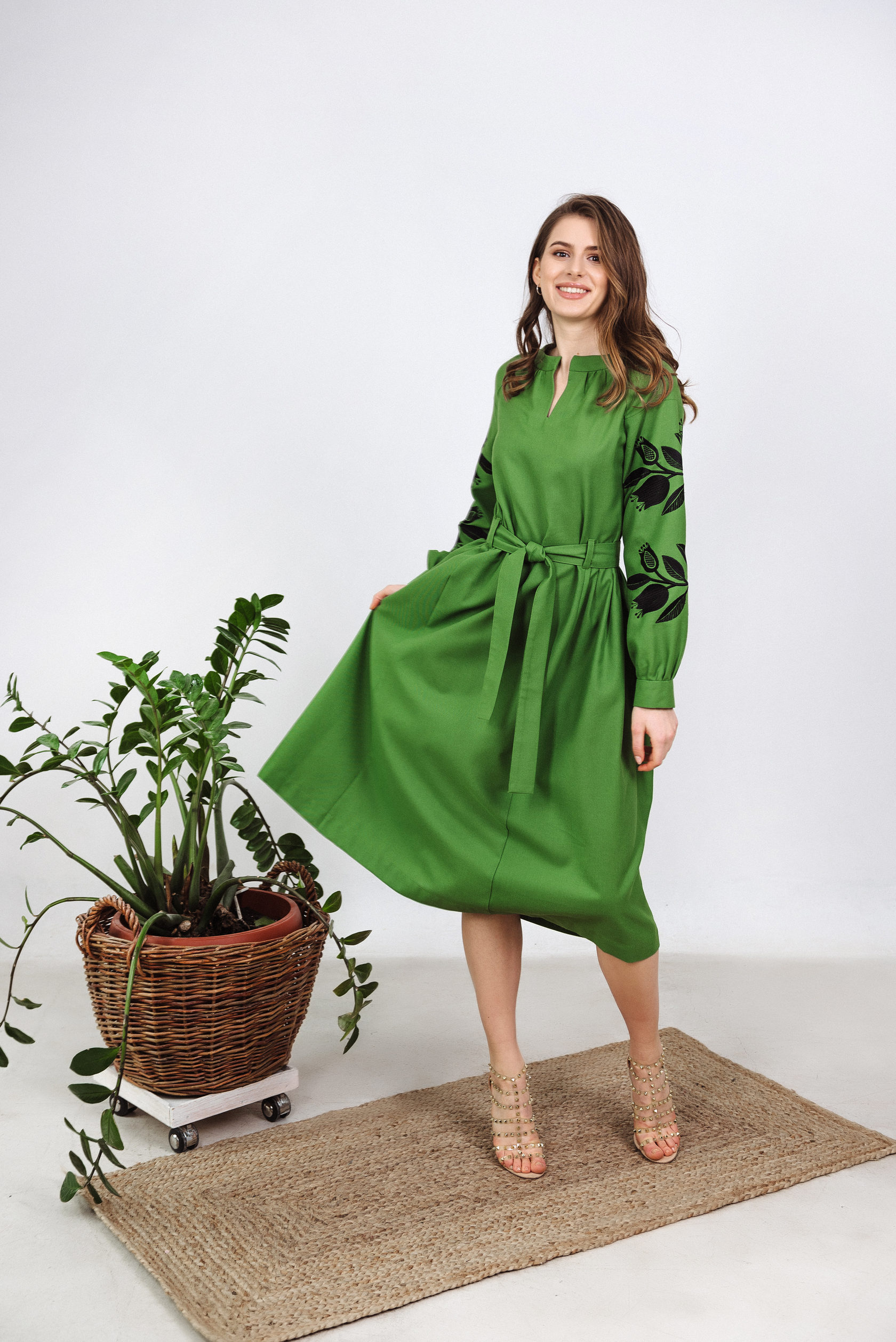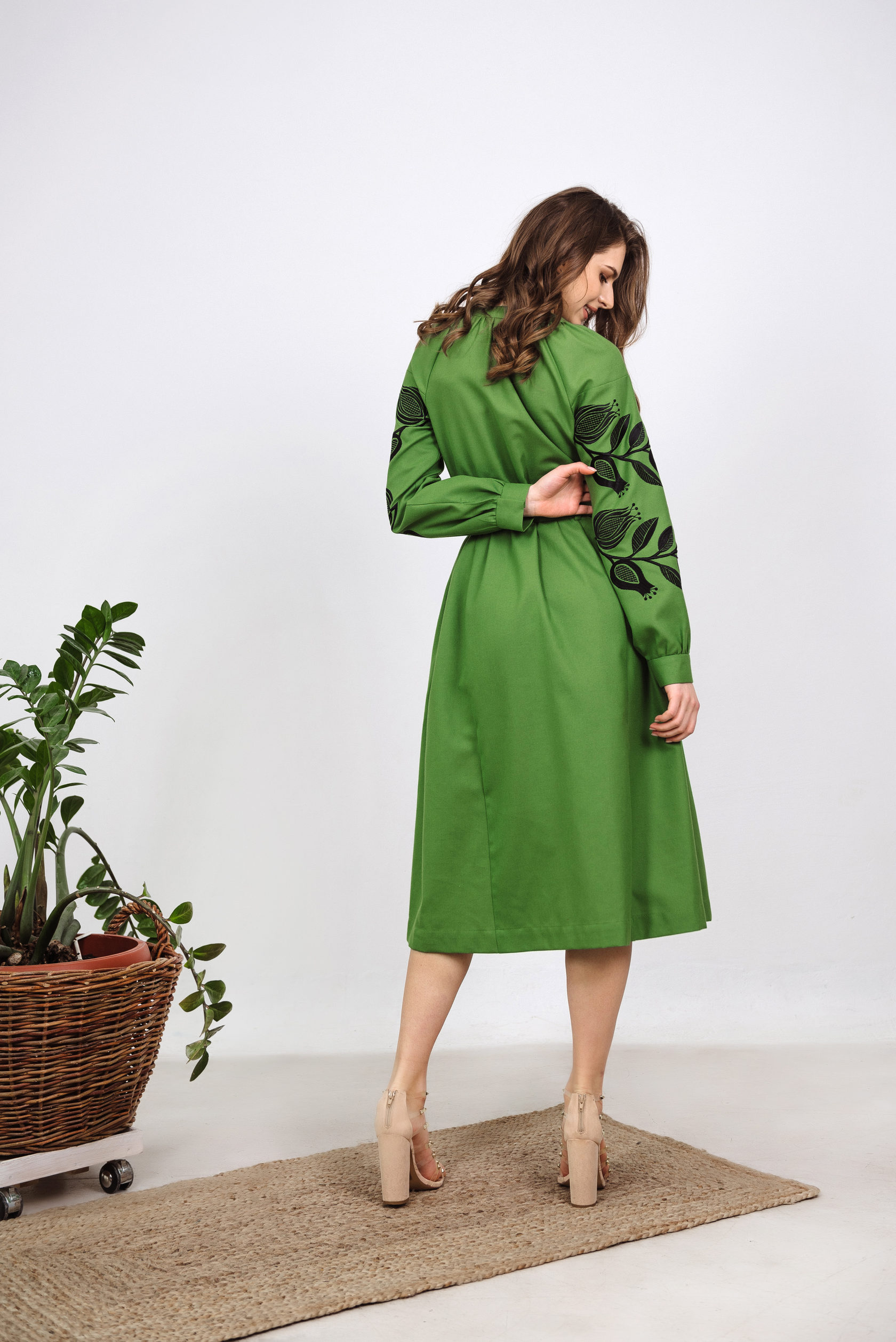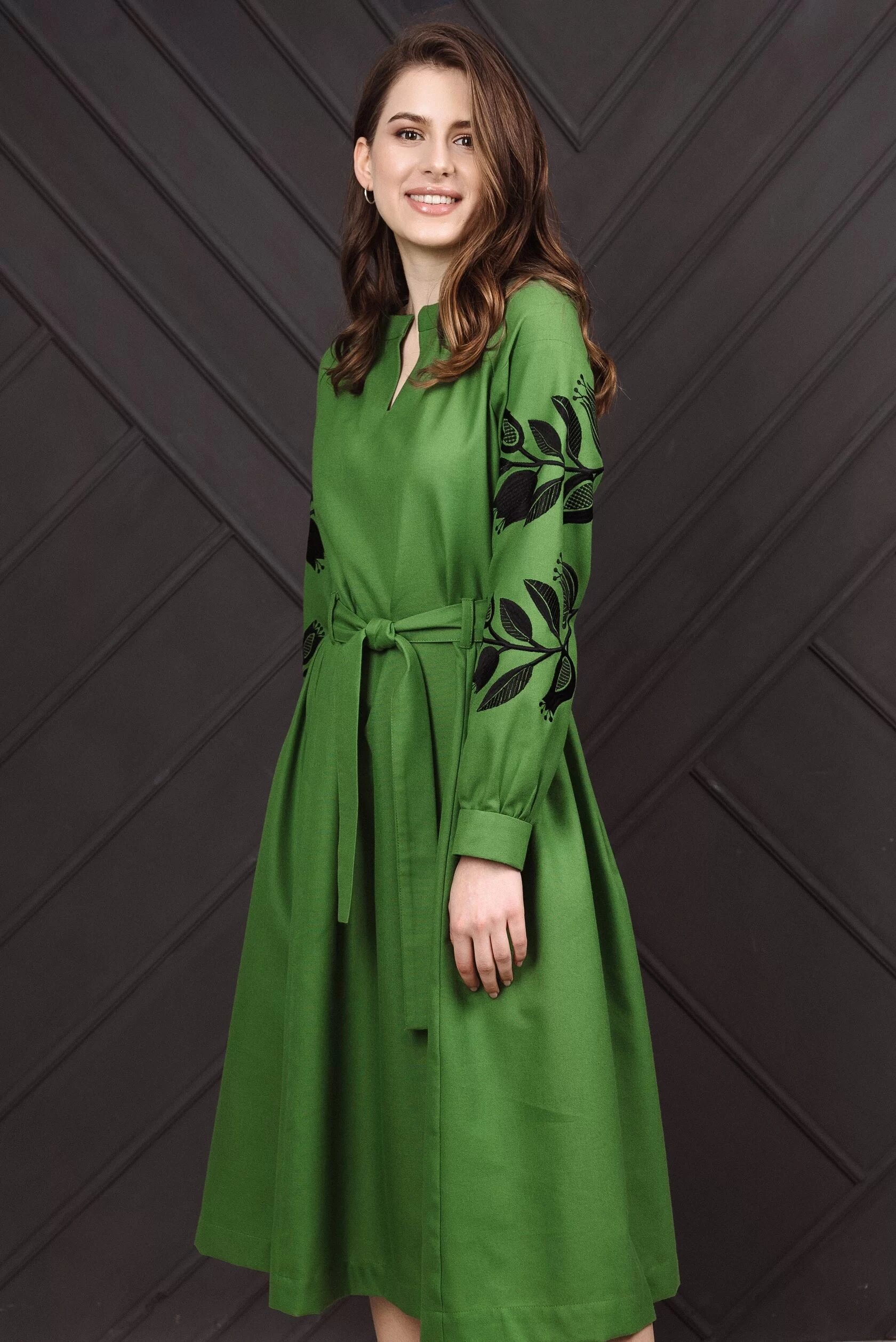 Жіноча сукня Шипшина (зелена) виконана на бавовняній тканині, тип вишивки гладдю. Дану модель шиємо на замовлення, термін до 10 днів