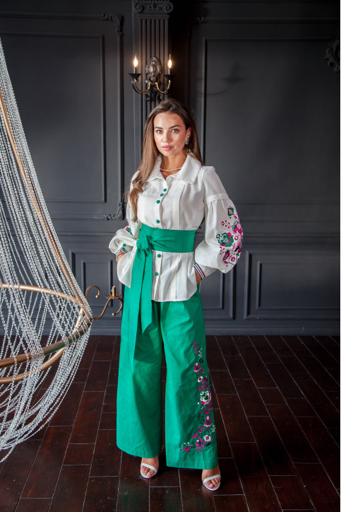 Жіночий вишитий костюм Верховина(зелений) складається з вишиванки, штанів та пояса.