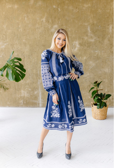 Жіночий костюм Неповторність (темно-синій) виконаний на льоні, тип вишивки хрестик з гладдю. Складається з сорочки та спідниці. Сорочку можна носити окремо
