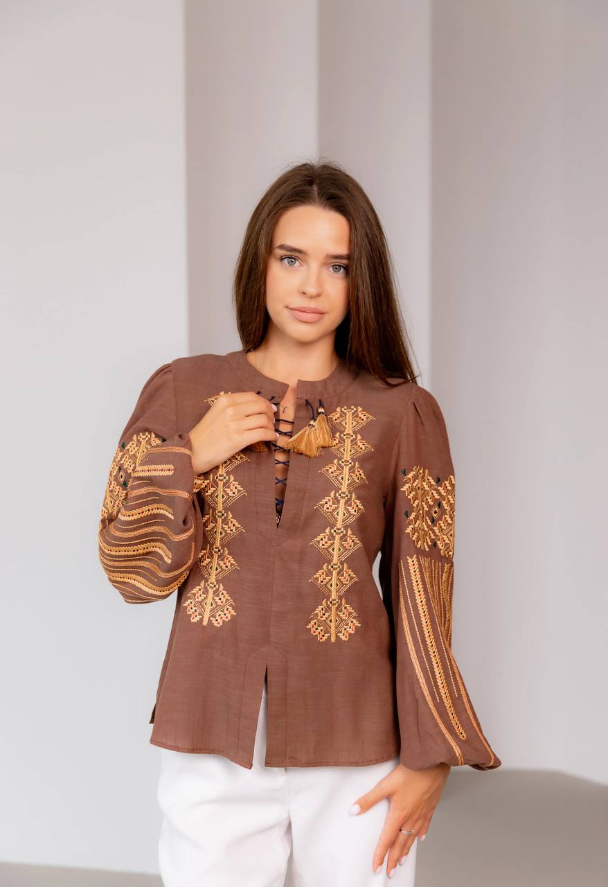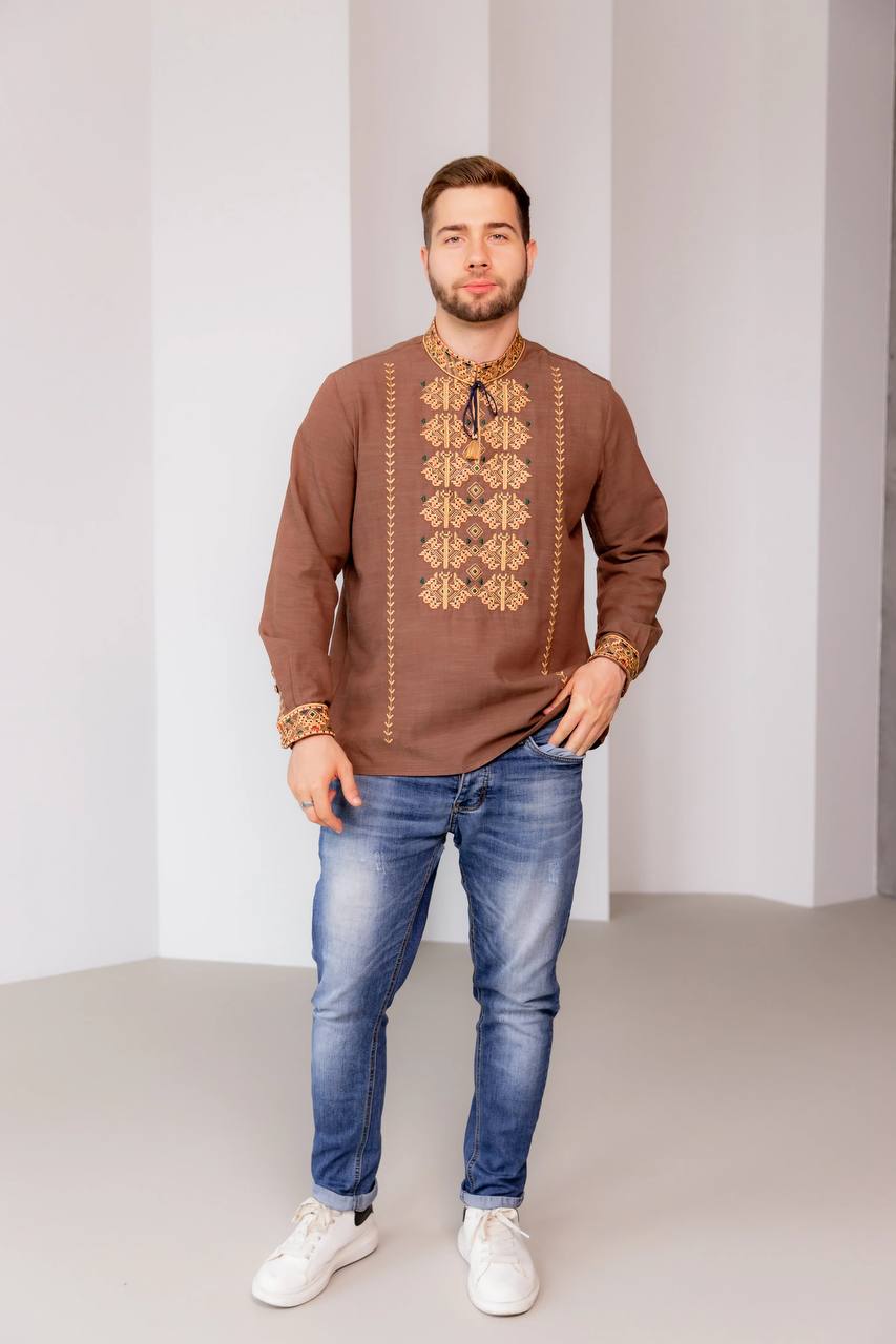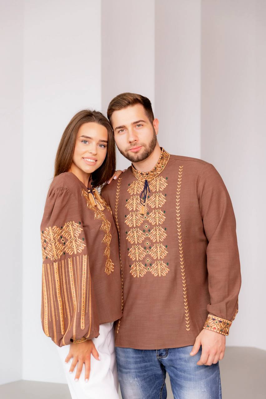 Парний комплект Залісся (коричневий) виконаний на натуральній тканині.