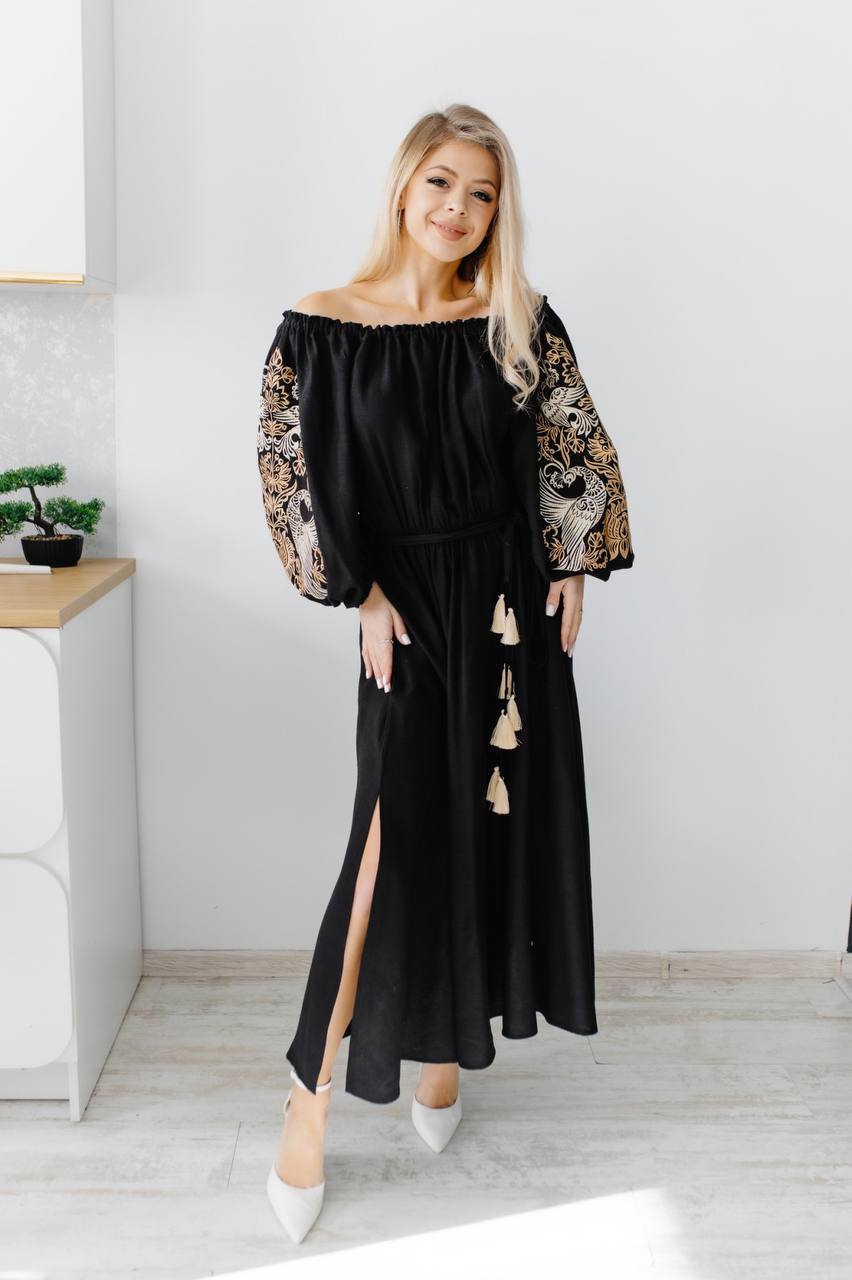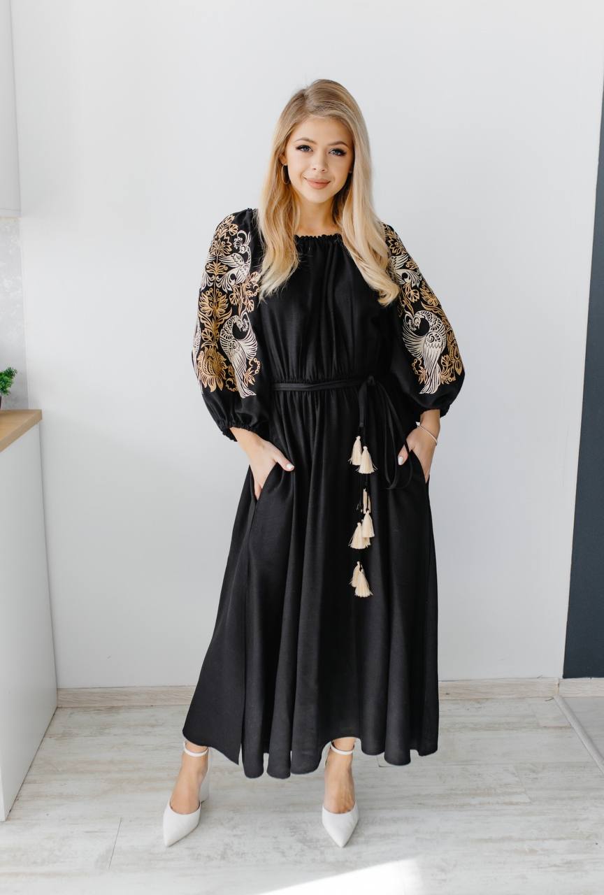 Жіноча сукня Жар-Птиця (чорна) виконана на льоні. Елементом вишивки є птах Щастя, який несе радість та вдачу. Тип вишивки гладдю