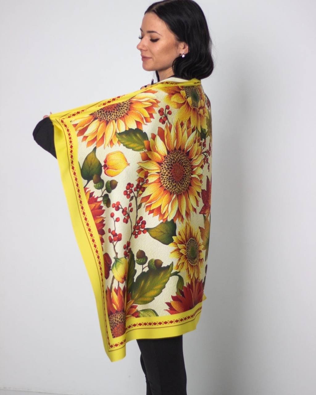 Хустка Соняхи виконана з штучного шовку марки Армані. Розмір 77/77 см. Вона доповнить Ваш образ та може стати гарним подарунком